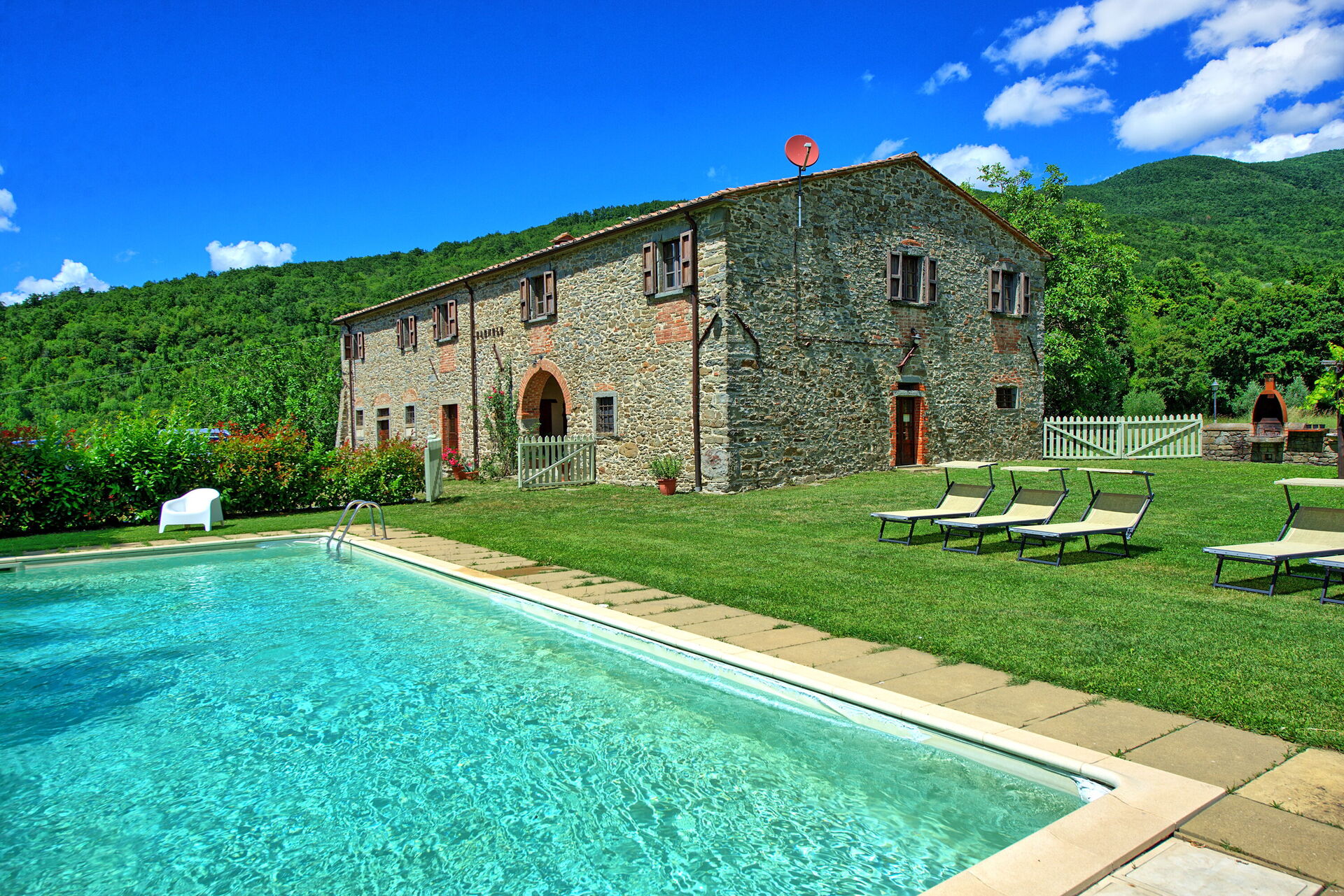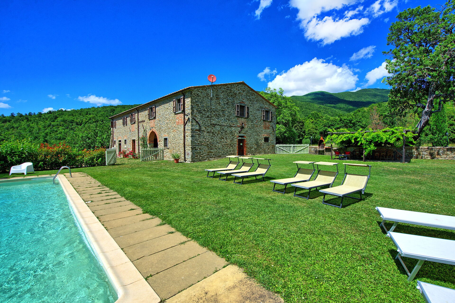 Prachtig stenen boerenhuis met een rustige en panoramische ligging in de omgeving van Arezzo en een weids uitzicht over de vallei van de Arno. Het terrein om het huis is volledig omheind en beschikt over grote buitenruimtes (2000 m2), een privé zwembad en mooie gemeubileerde ruimtes om buiten te kunnen eten. De villa is gerestaureerd met behoud van de originele kenmerken, zoals balkenplafonds en terracotta vloeren en een elegante en warme inrichting.
