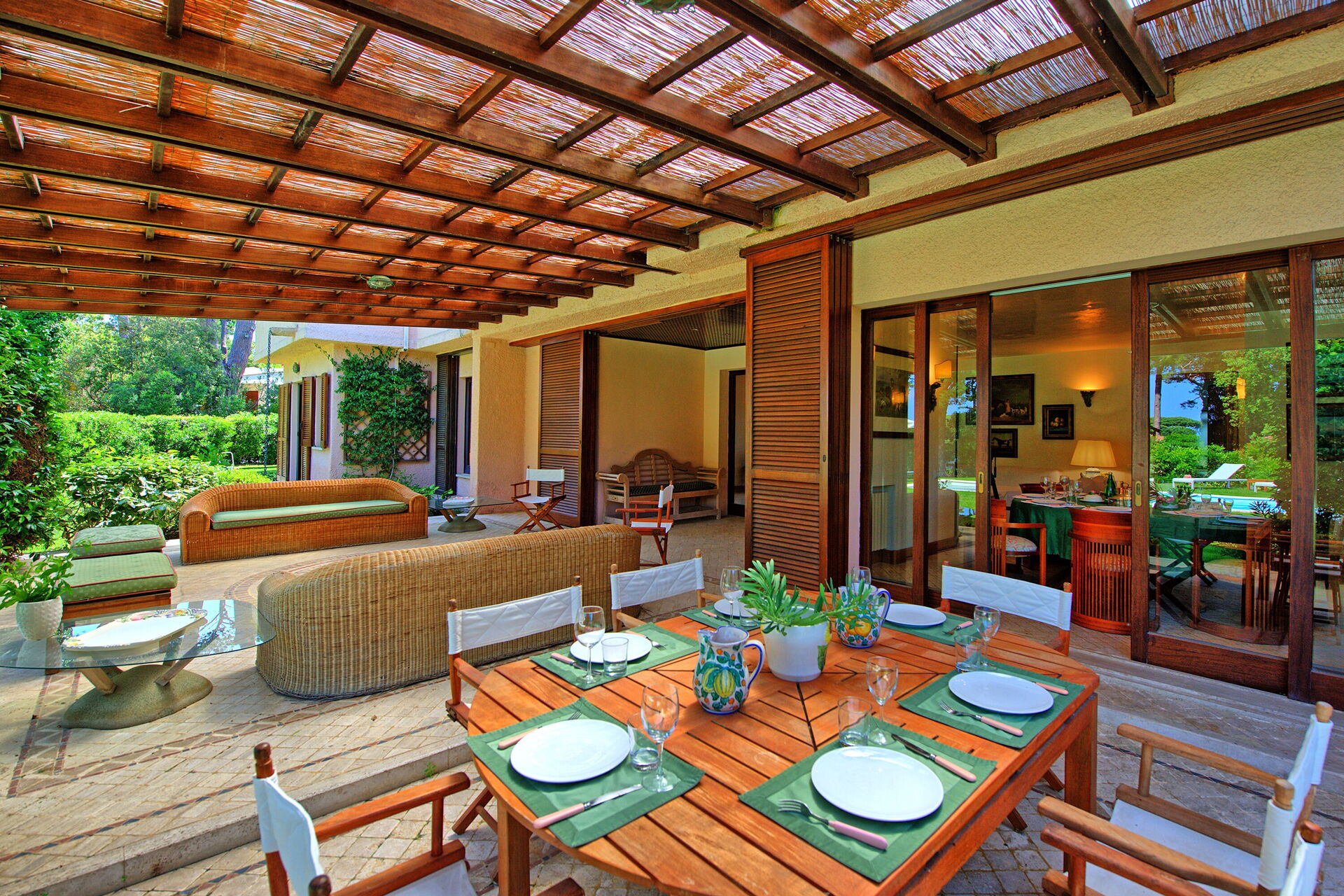 De grote, goed onderhouden privétuin is volledig omsloten en weelderig begroeid met planten die maximale privacy bieden. Er is een speciaal zwembad om af te koelen op warme zomerdagen, evenals twee buitenruimtes en loggia's met tafel en stoelen die perfect zijn om buiten te dineren.