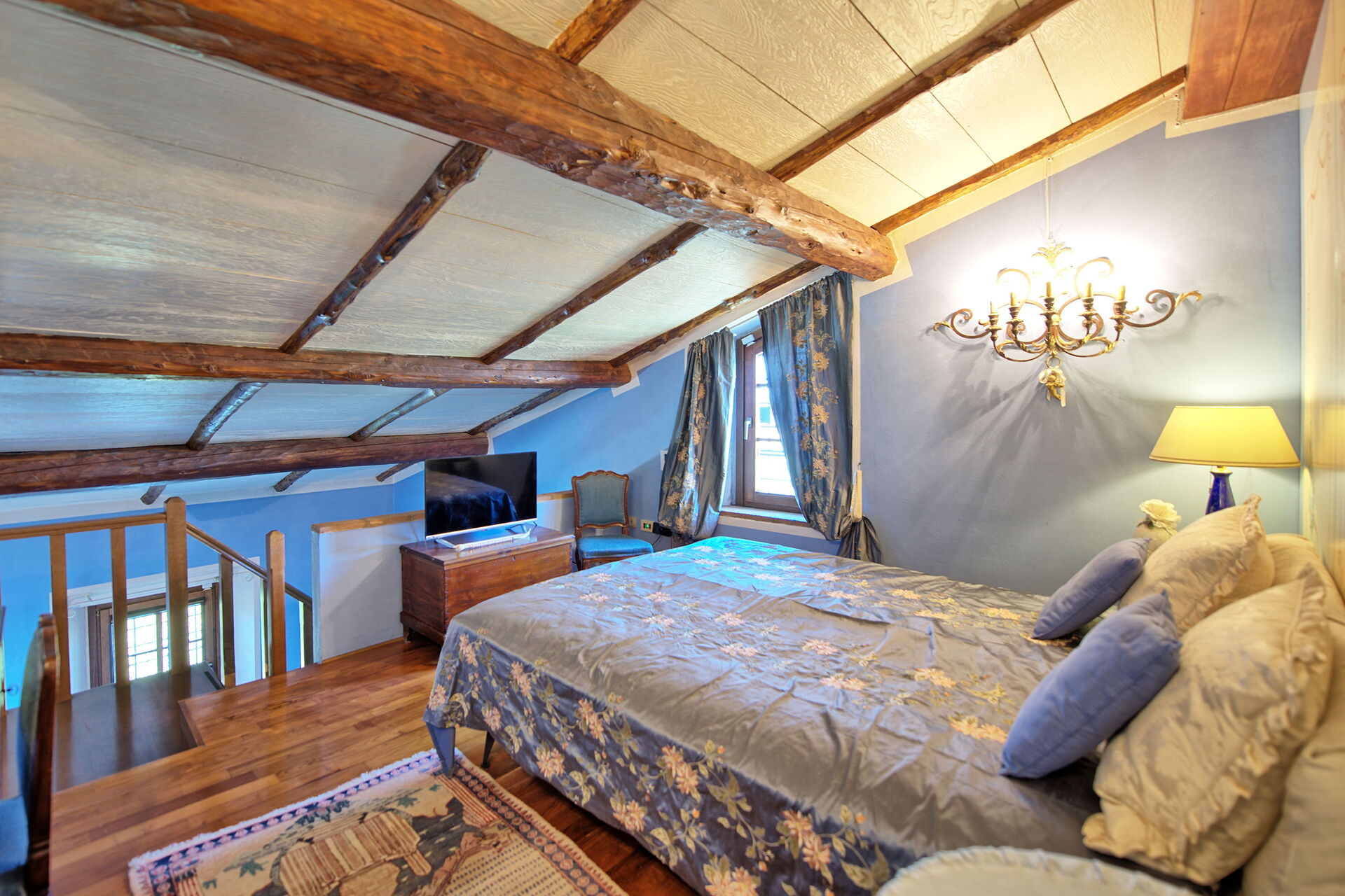 Eerste verdieping: tweepersoonsslaapkamer (airconditioning), badkamer met douche, suite met kleine woonkamer (smart-tv), eigen badkamer met bad, tweepersoonsslaapkamer (airconditioning) in een loft (minimale hoogte: 2,60 meter; maximale hoogte: 1,8 meter).
