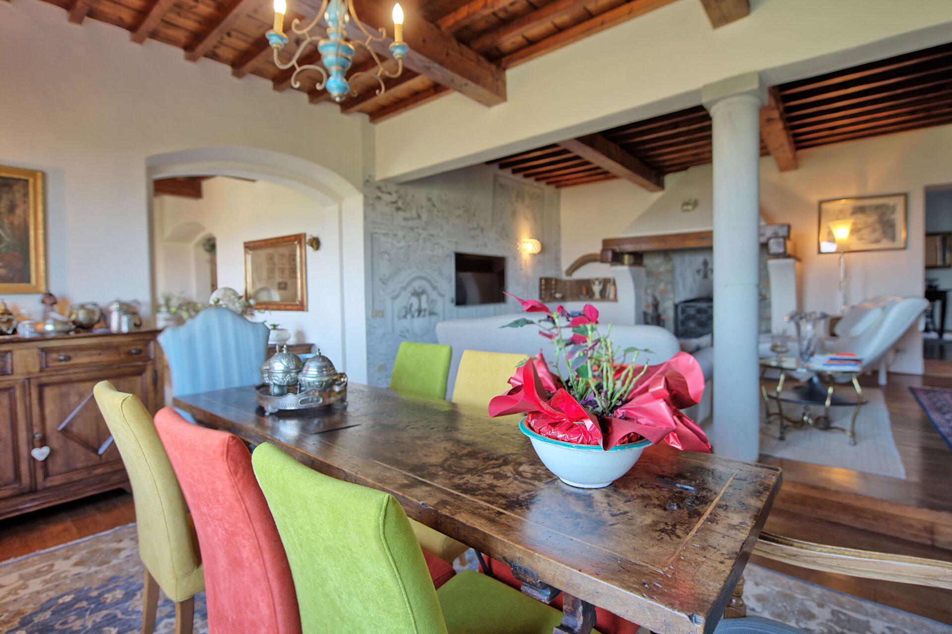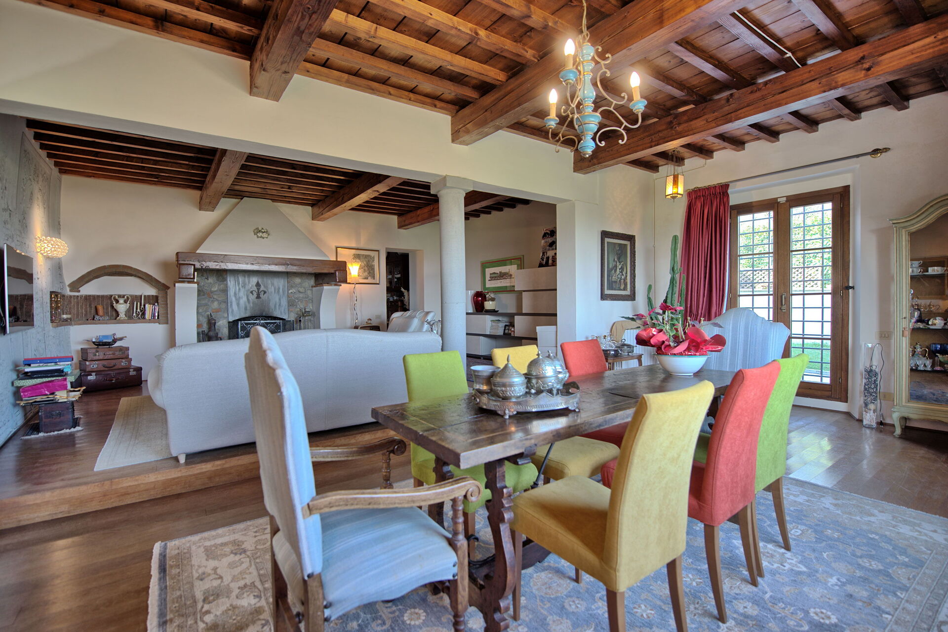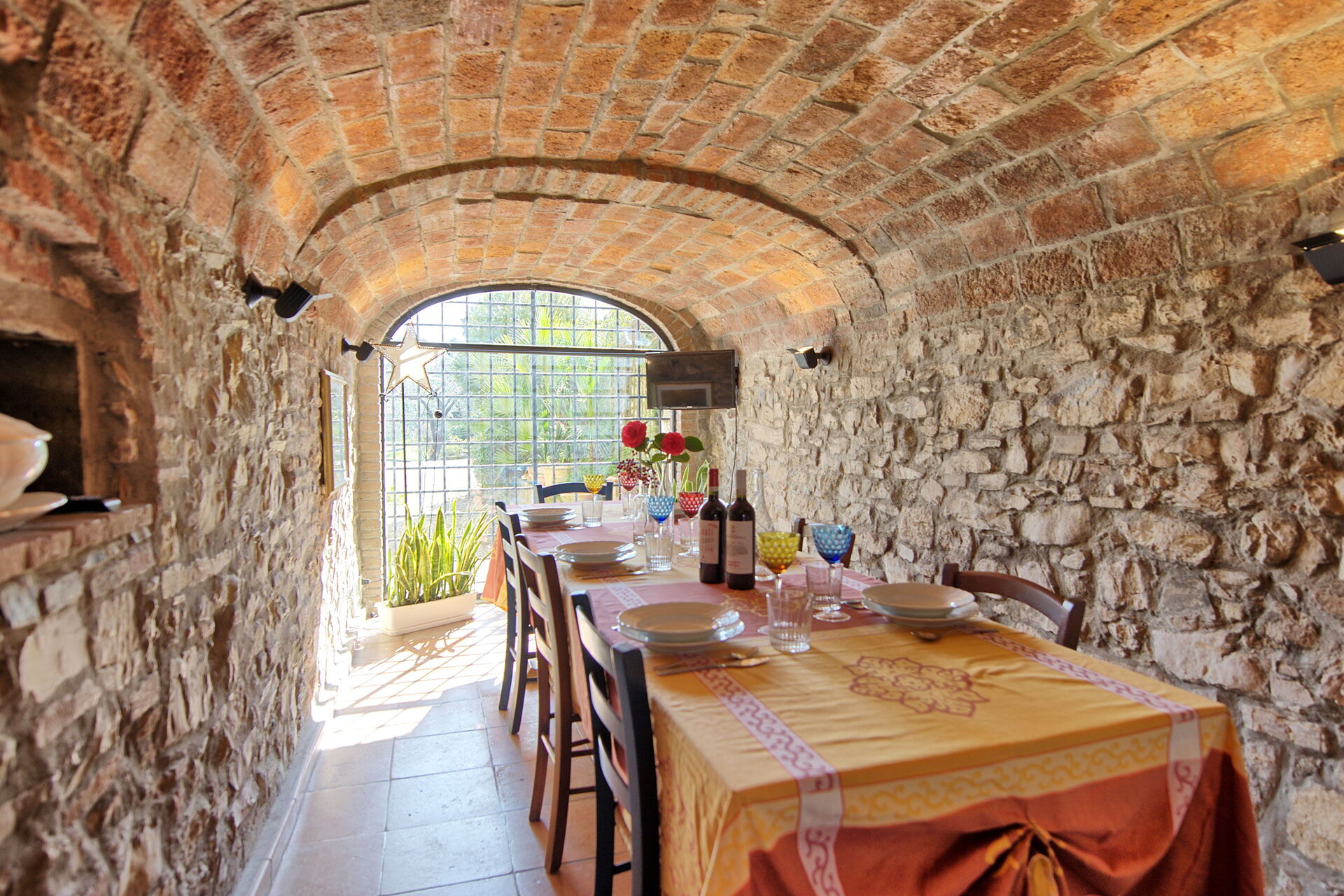 2 treden lager: charmante woonkamer met grote tafel en gewelfd stenen plafond, keuken (niet werkende open haard, kookplaat, oven, koelkast, vriezer, vaatwasser, magnetron, broodrooster, espressomachine) en toegang tot de patio met een glazen veranda (toegankelijk van buitenaf, en niet verbonden aan de binnenkant met de rest van de villa) ingericht met tafel en stoelen.