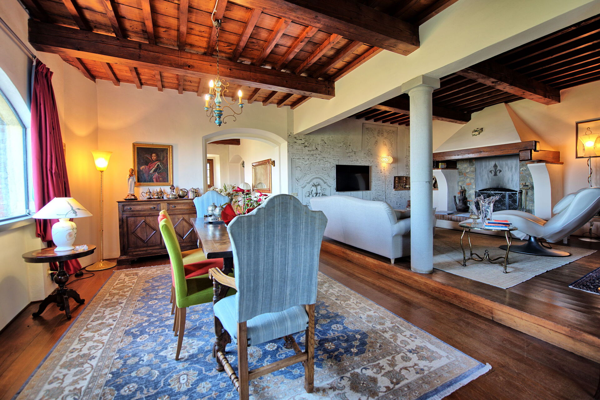 1 trede omlaag: grote, lichte woonkamer met eethoek (niet-werkende open haard, smart-tv, wifi-internet) met grote ramen en panoramisch uitzicht op de vallei.