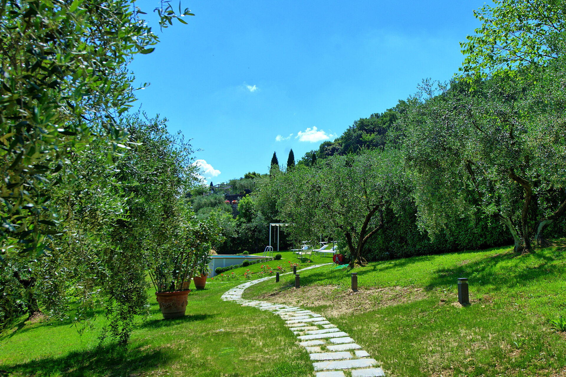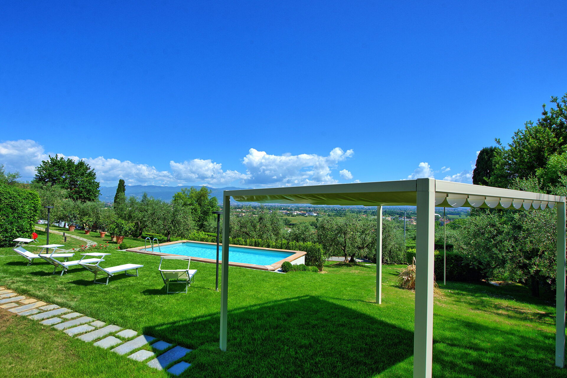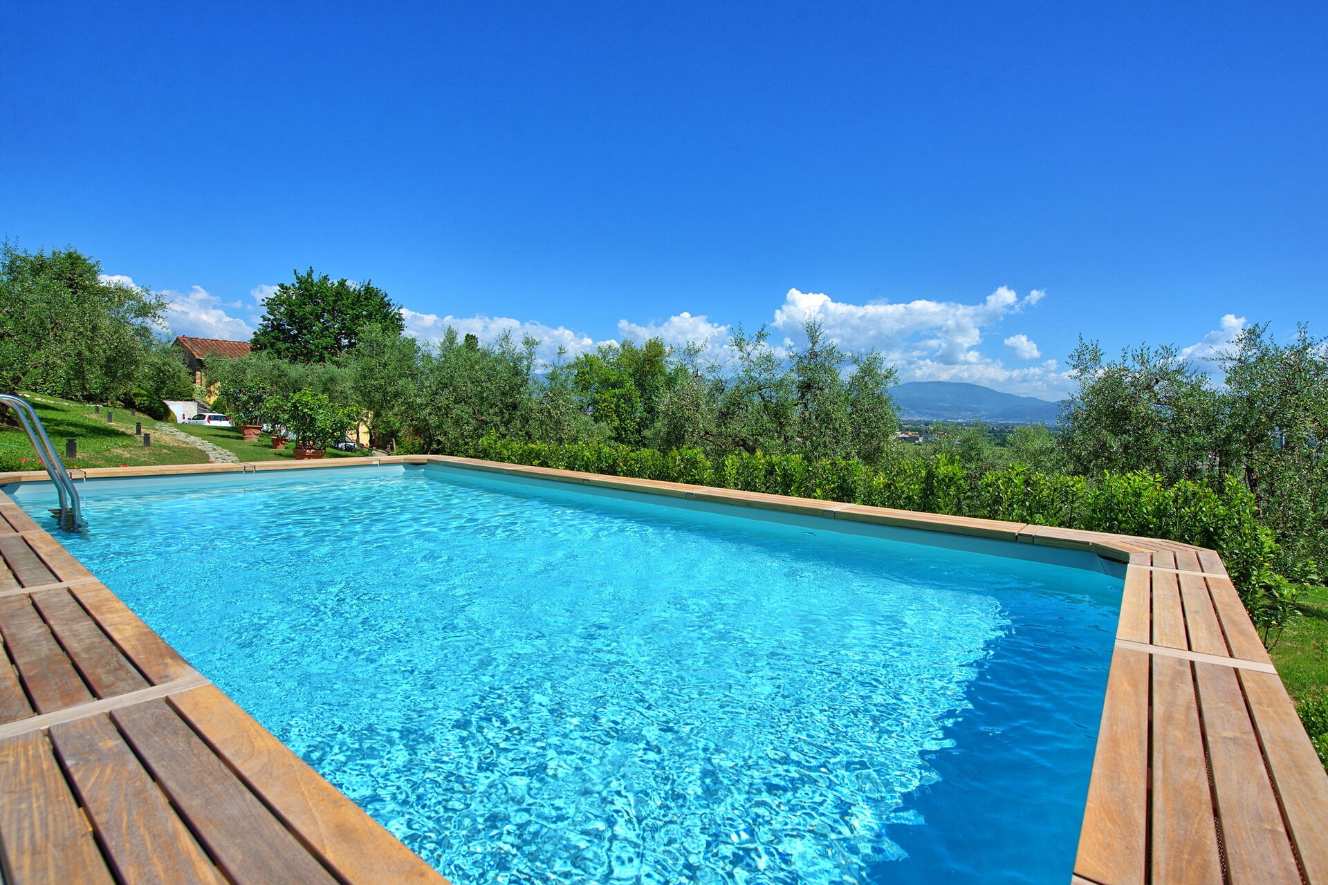De villa ligt genesteld in de glooiende, met olijfbomen bedekte heuvels die kenmerkend zijn voor dit deel van Toscane.