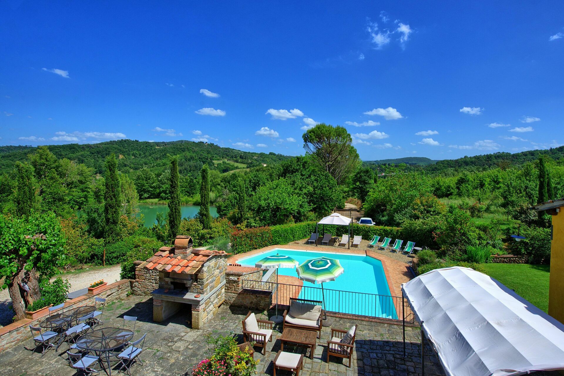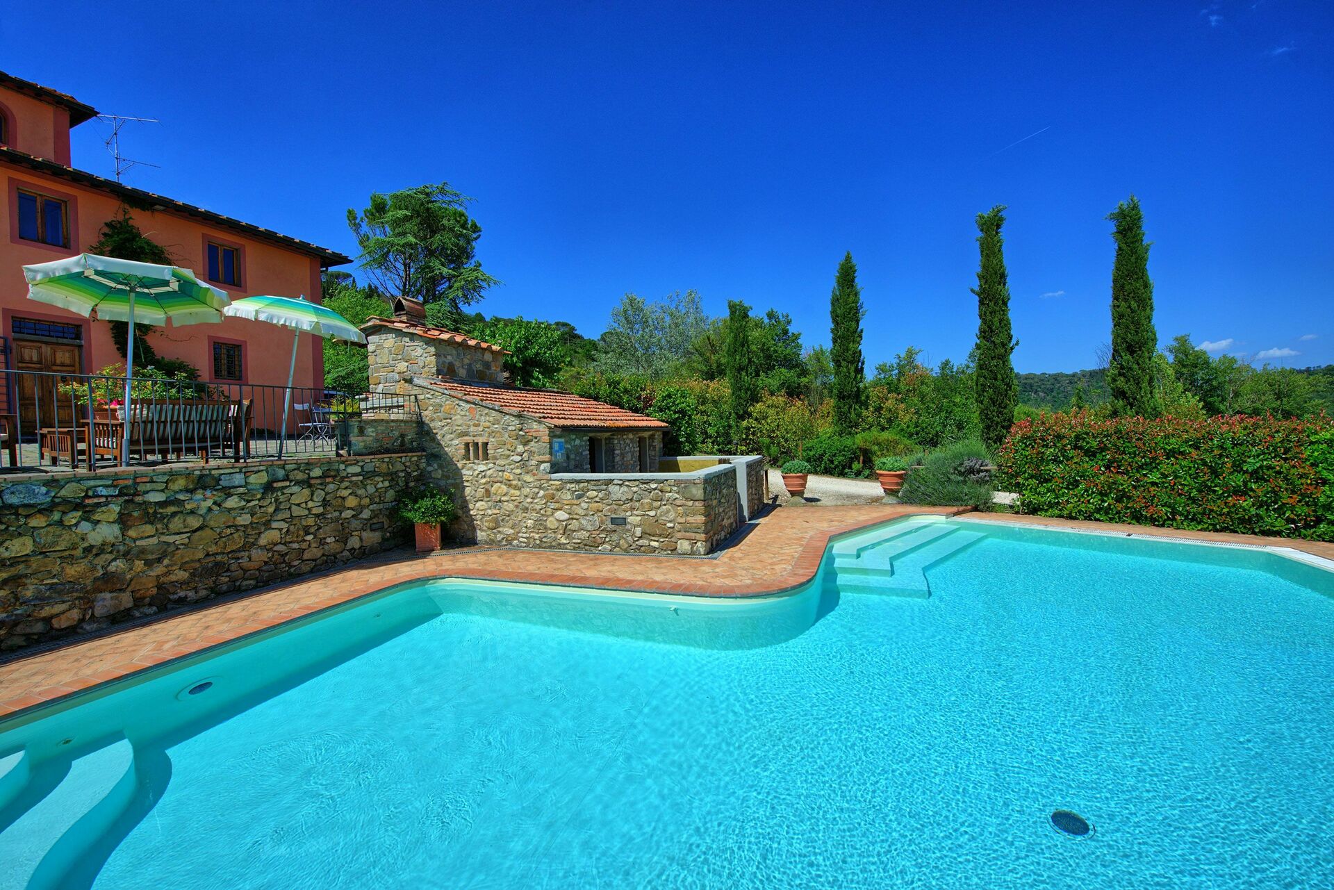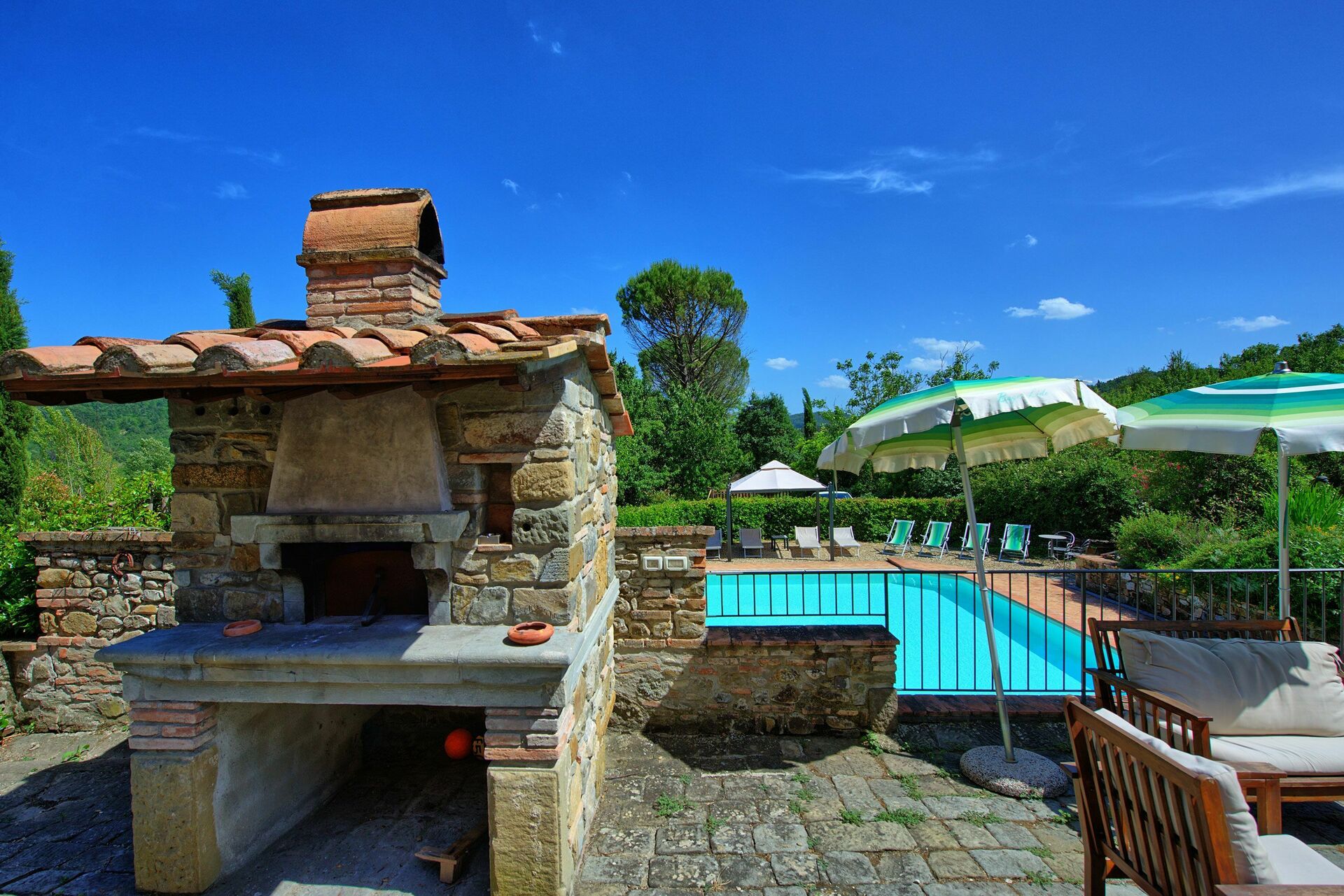 Buiten biedt deze prachtige villa een adembenemend panoramisch uitzicht op de heuvels en het omliggende landschap. Een goed onderhouden tuin omringt het pand en biedt een groot privézwembad met ligstoelen en parasols: de ideale plek om onvergetelijke momenten door te brengen met uw vrienden en familie. Een barbecueplek met tafels en stoelen is ideaal om buiten te eten en te genieten van het uitzicht op de natuur en de buitenlucht.