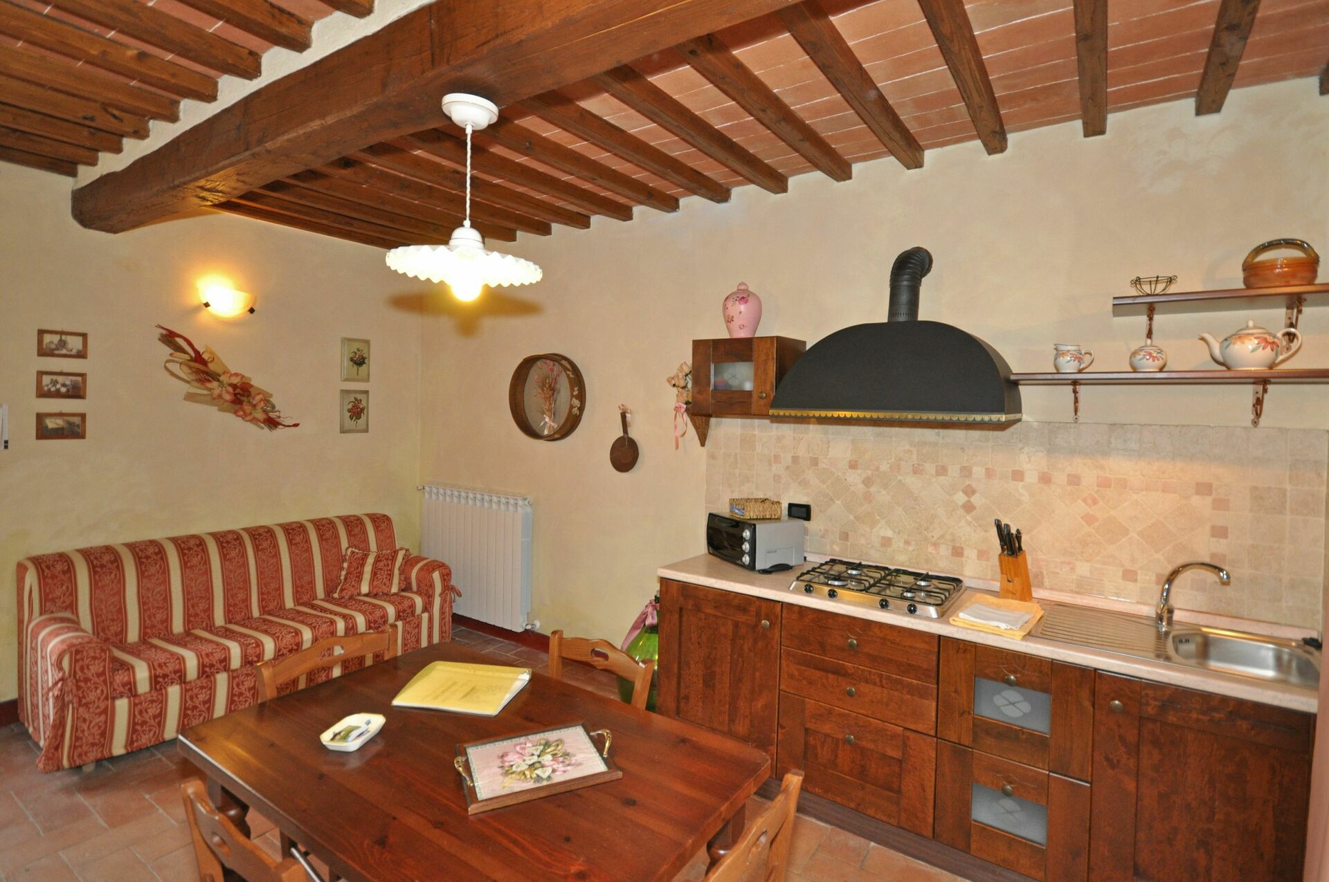 B.G. (2 treden lager): woon/eetkamer met tweepersoonsbedbank (30 € per persoon per dag) en keukenhoek (elektrisch oventje, kleine vriezer).