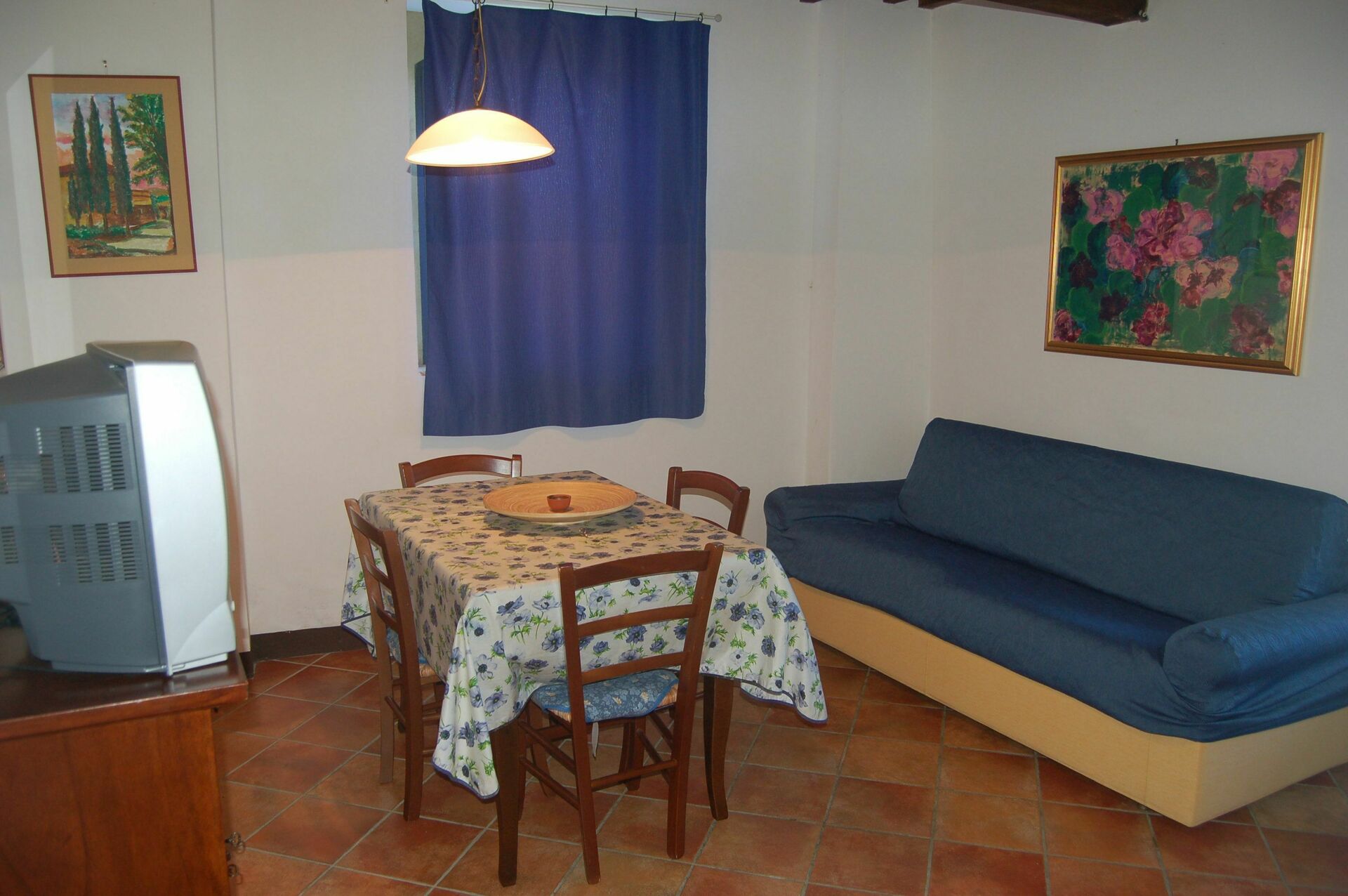 The wide lounge has a terracotta glazed floor and a comfortable table. The ceiling with wooden beams and bricks is typical of the old Tuscan farmhouses. The fully equipped kitchen is on the left of the main door.