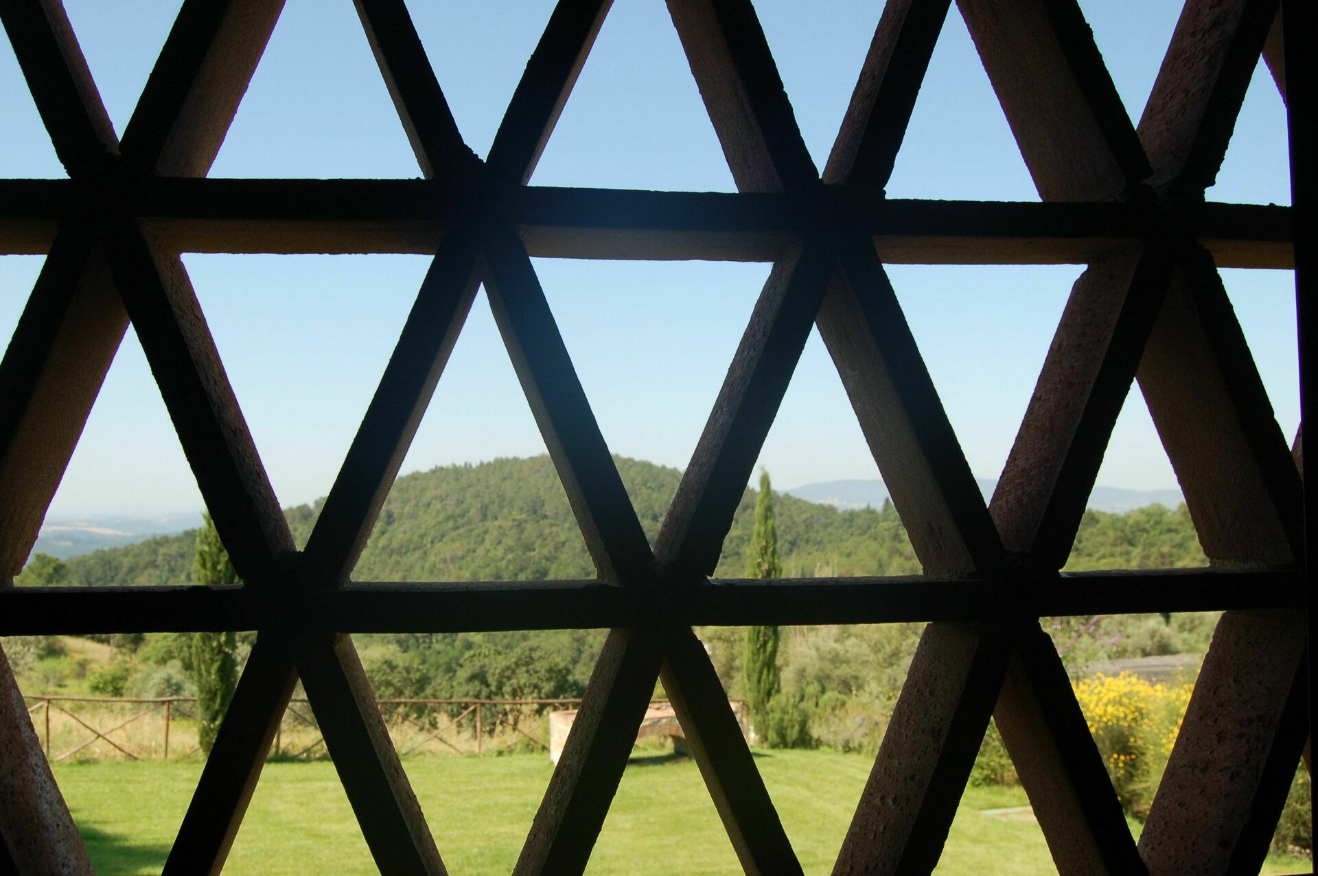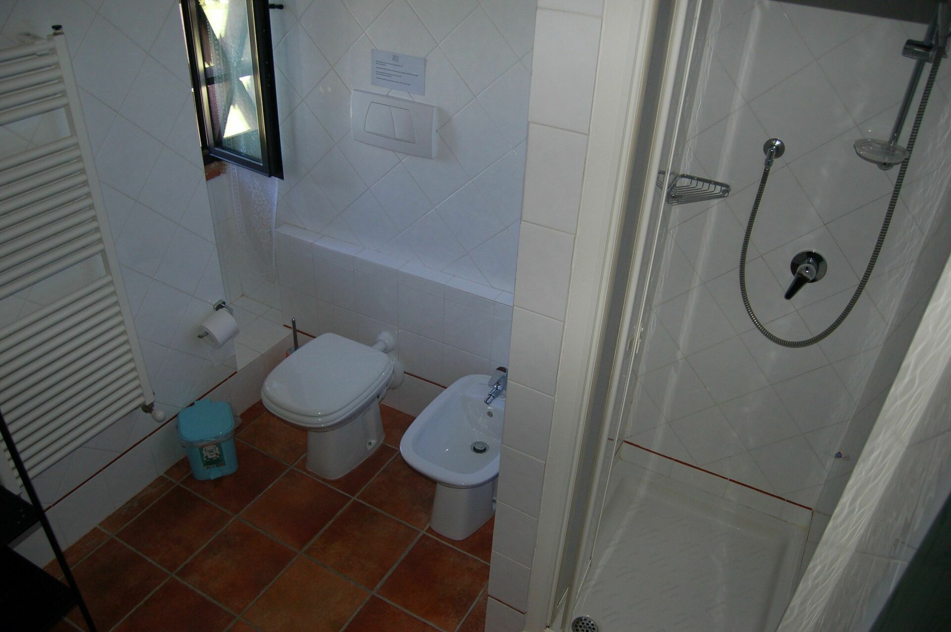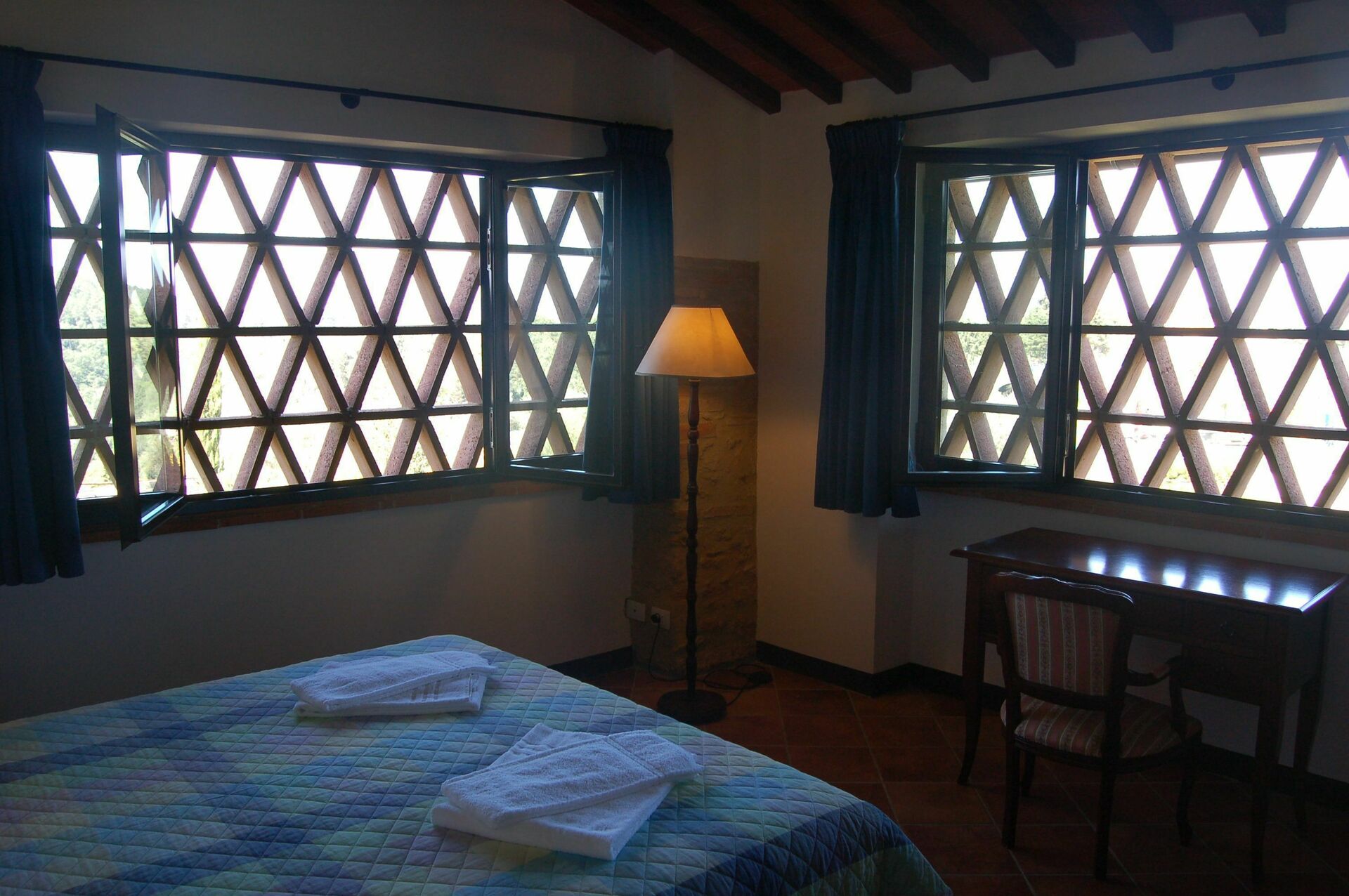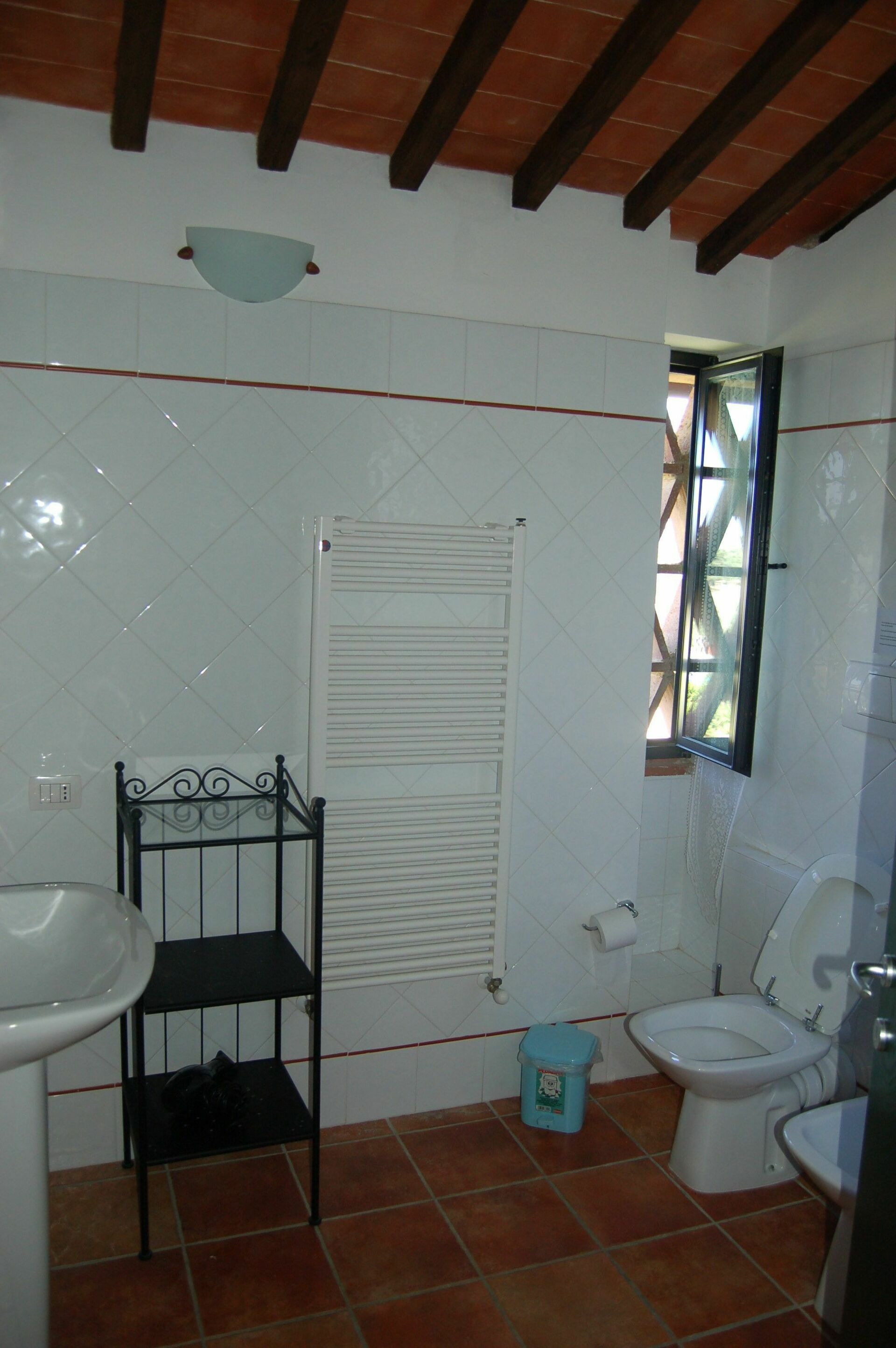 Beautiful Terracotta glazed stairs lead to the first bedroom with twin beds in the upper floor. The wide window of the room is sheltered by the typical thin terracotta bricks, which allow enjoying the wonderful landscape of the valley and its olive groves but being protected from the warmth of the sun in the hottest hours.