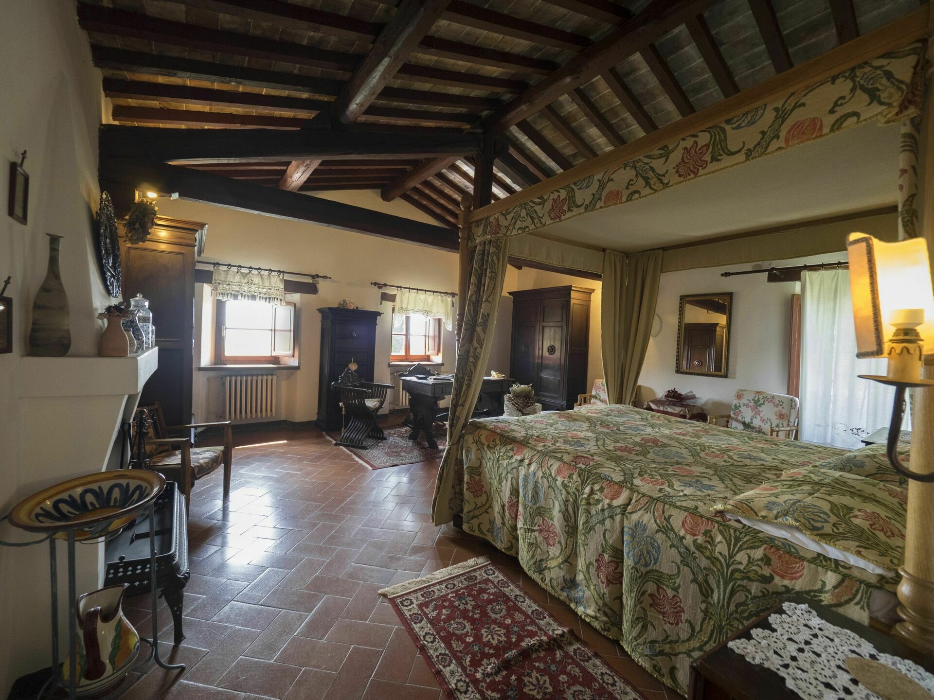 1° verdieping: grote slaapkamer met tweepersoonsbed met antieke meubels en open haard, badkamer met douche (2 wastafels) en klein balkon met mooi uitzicht, slaapkamer met 2 eenpersoonsbedden en badkamer met douche, slaapkamer met tweepersoonsbed met badkamer met douche.