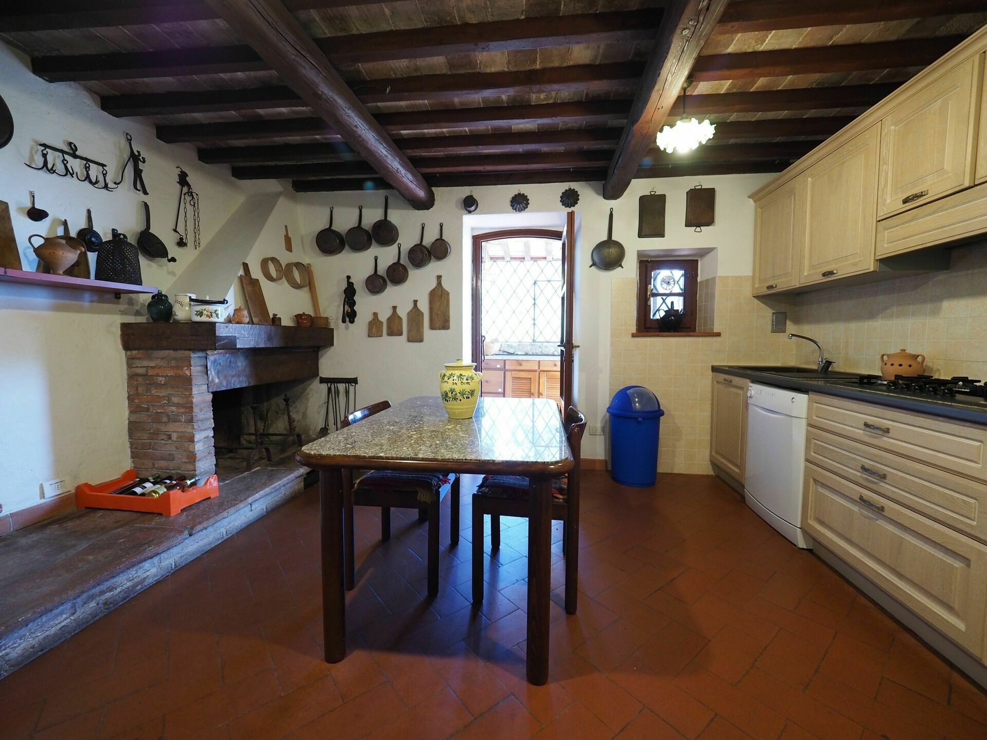 B.G.: ruime woonkamer met banken en fauteuils, mooie eetkamer, 3 treden hoger komt men in een ruime goed uitgeruste keuken (oven, diepvriezer, vaatwasser, broodrooster, koffiezetapparaat) met grote open haard ideaal voor het grillen, veranda gebruikt als bijkeuken en toegang tot een groot terras met tafel en stoelen. 2 treden hoger: toilette.