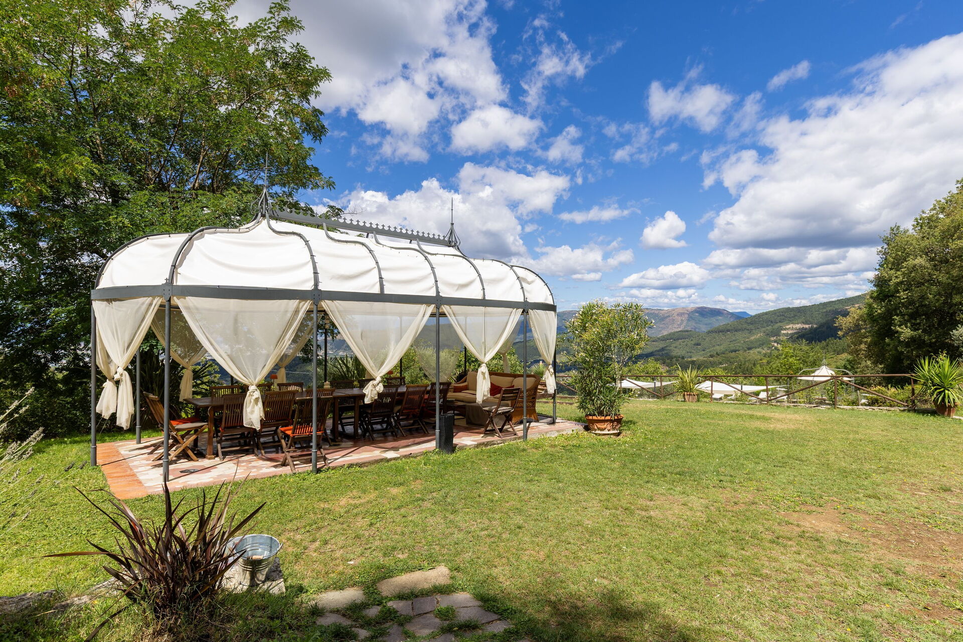 The first time Daniele showed us the garden my jaw was permanently fixed to the ground because of it's beauty. Rolling hills of greenery and the distant shimmer of the nearest town in the distance make for a stunning view, of which the sunset is spectacular. Considering the villa sleeps 17 people, you're never short of somewhere to sit. Comfy sun loungers overlook the swimming pool and the view and then there's a shaded area with comfy sofas and heavenly white linen swaying in the breeze!