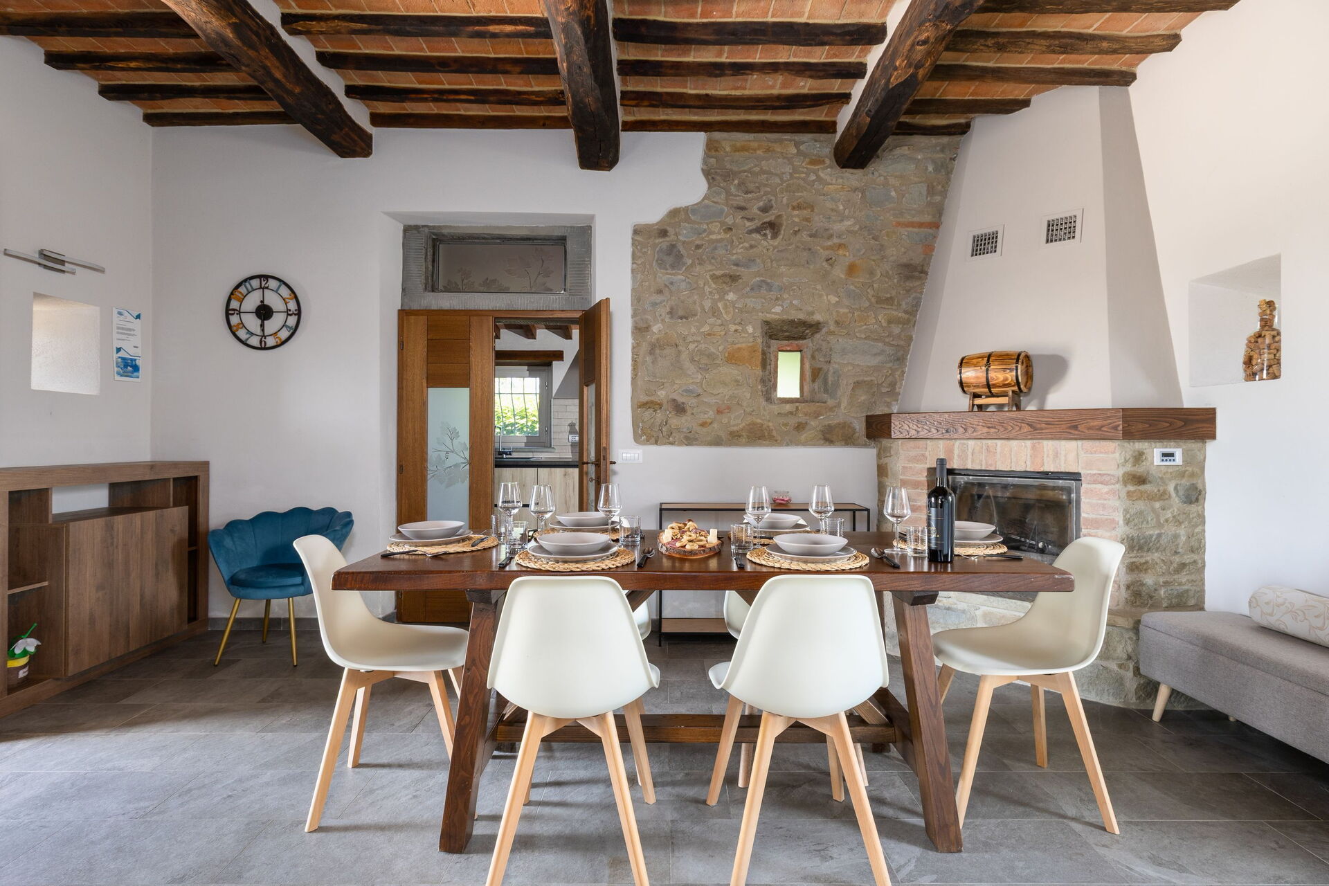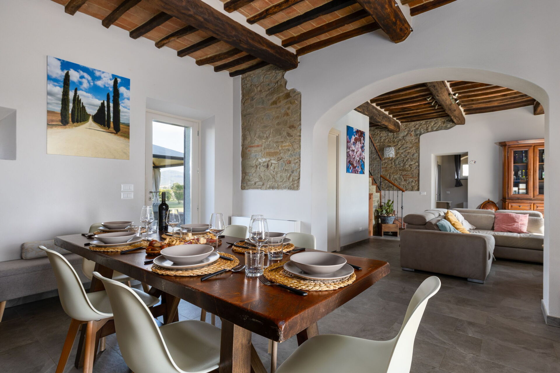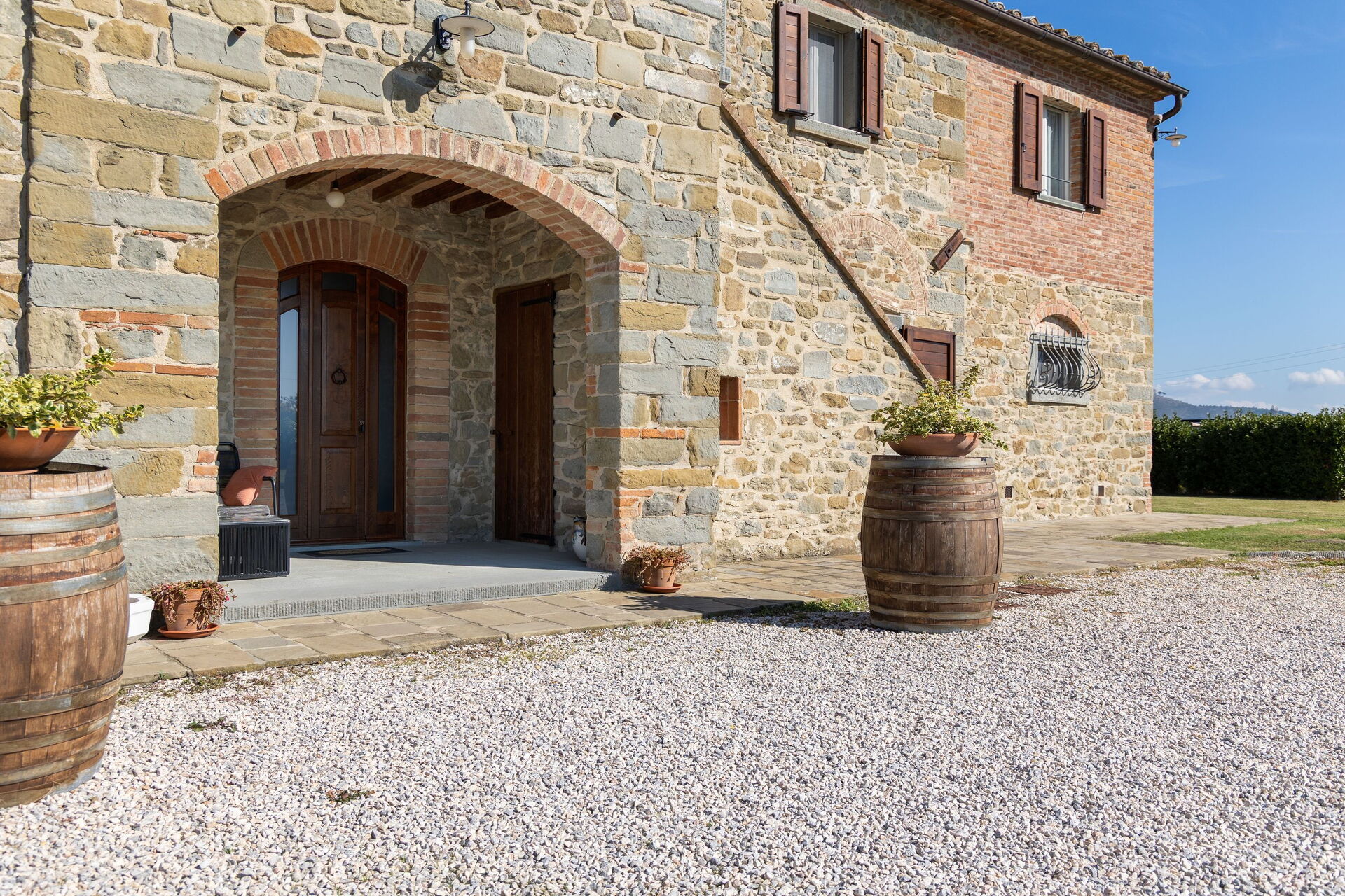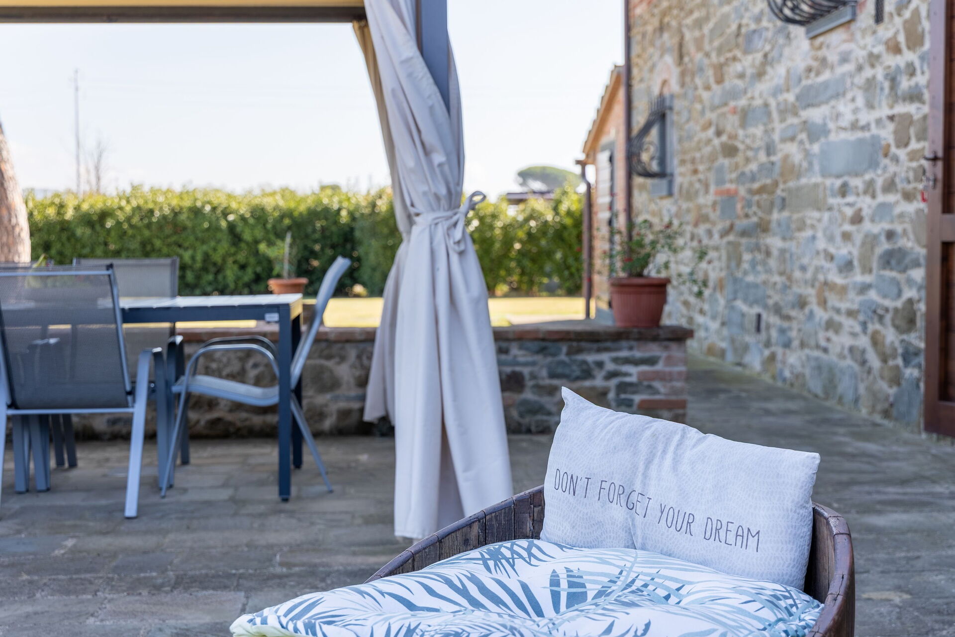 De grote, gemeubileerde buitenruimtes van de vakantievilla zijn perfect om tijd door te brengen in de buitenlucht. Gasten kunnen genieten van een groot nieuw zwembad met een panoramisch uitzicht op het landschap en Cortona, evenals van een buitenterras naast de villa om buiten te eten.
