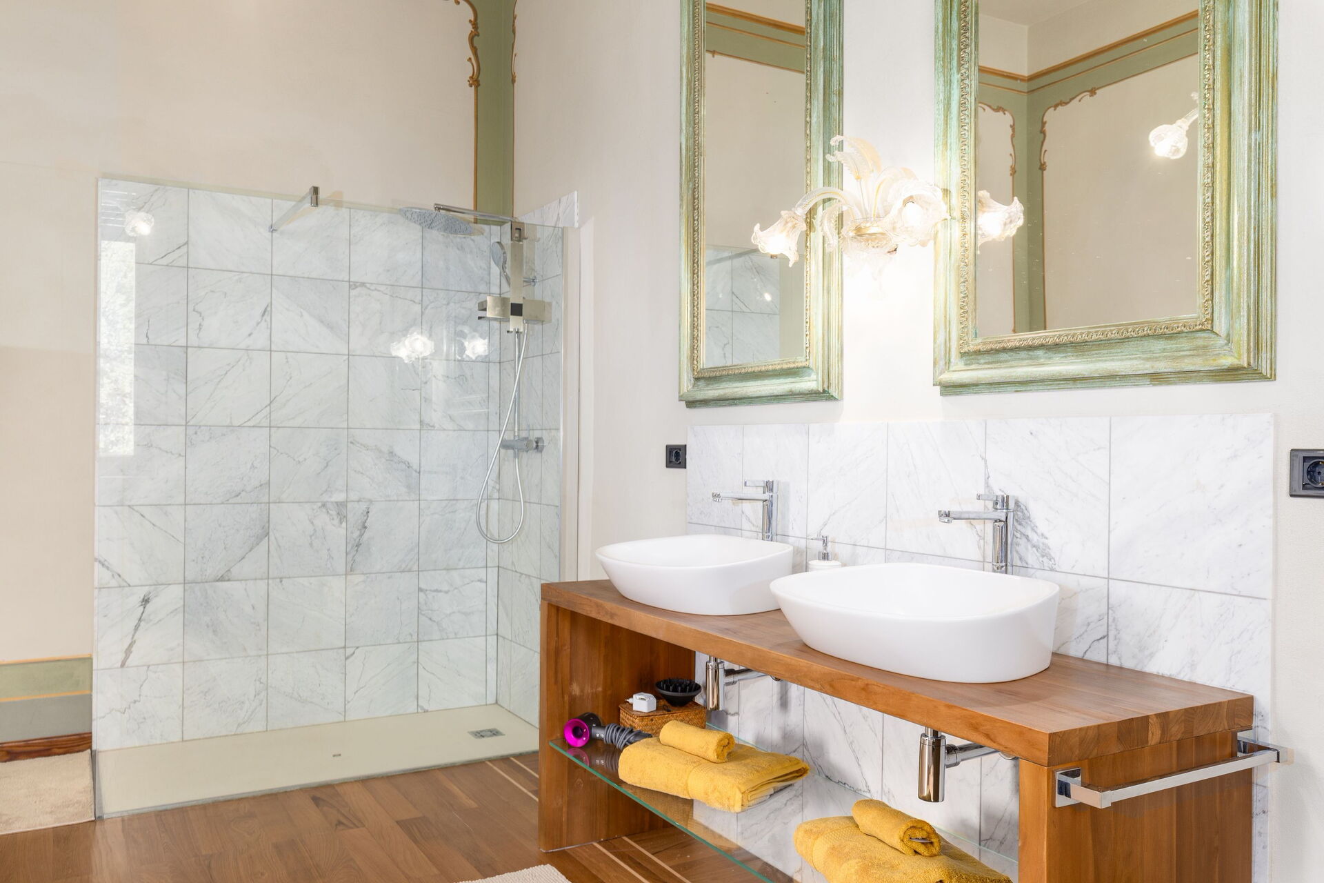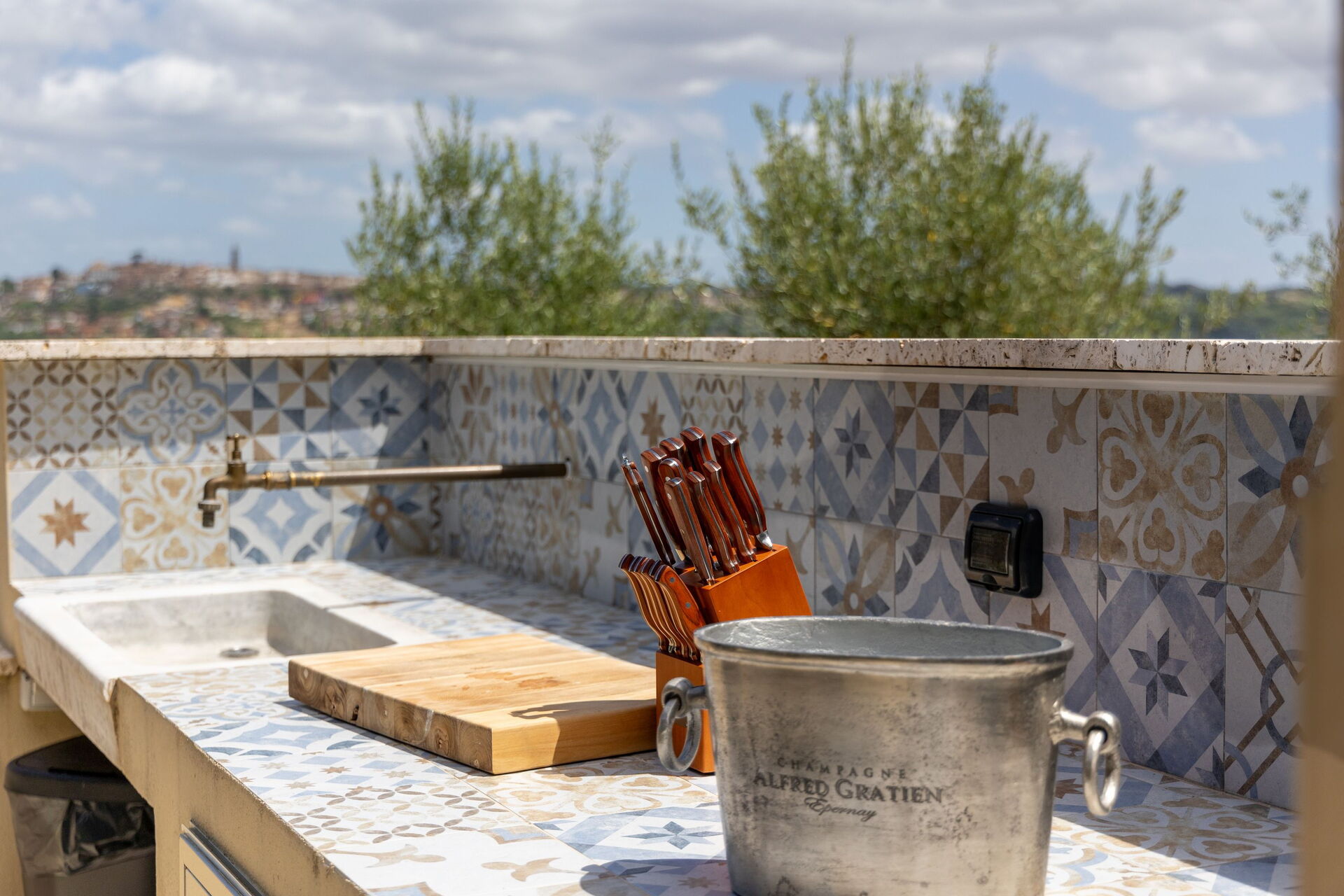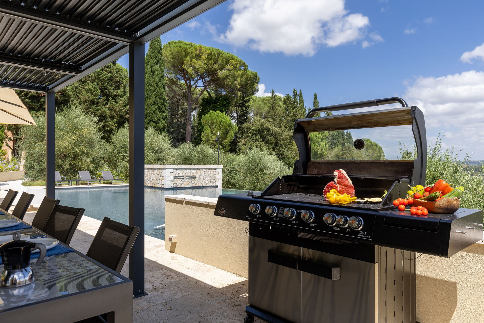 Een prachtig zonneterras van travertijn met ligstoelen en parasols omringt het infinity-zwembad, dat ook beschikt over een bubbelhoek en een waterval met chromotherapie. Dit is de perfecte plek om te ontspannen of af te koelen op zonnige zomerdagen met vrienden en familie. Gasten hebben ook toegang tot een barbecuegedeelte dat is uitgerust voor buitenmaaltijden.
