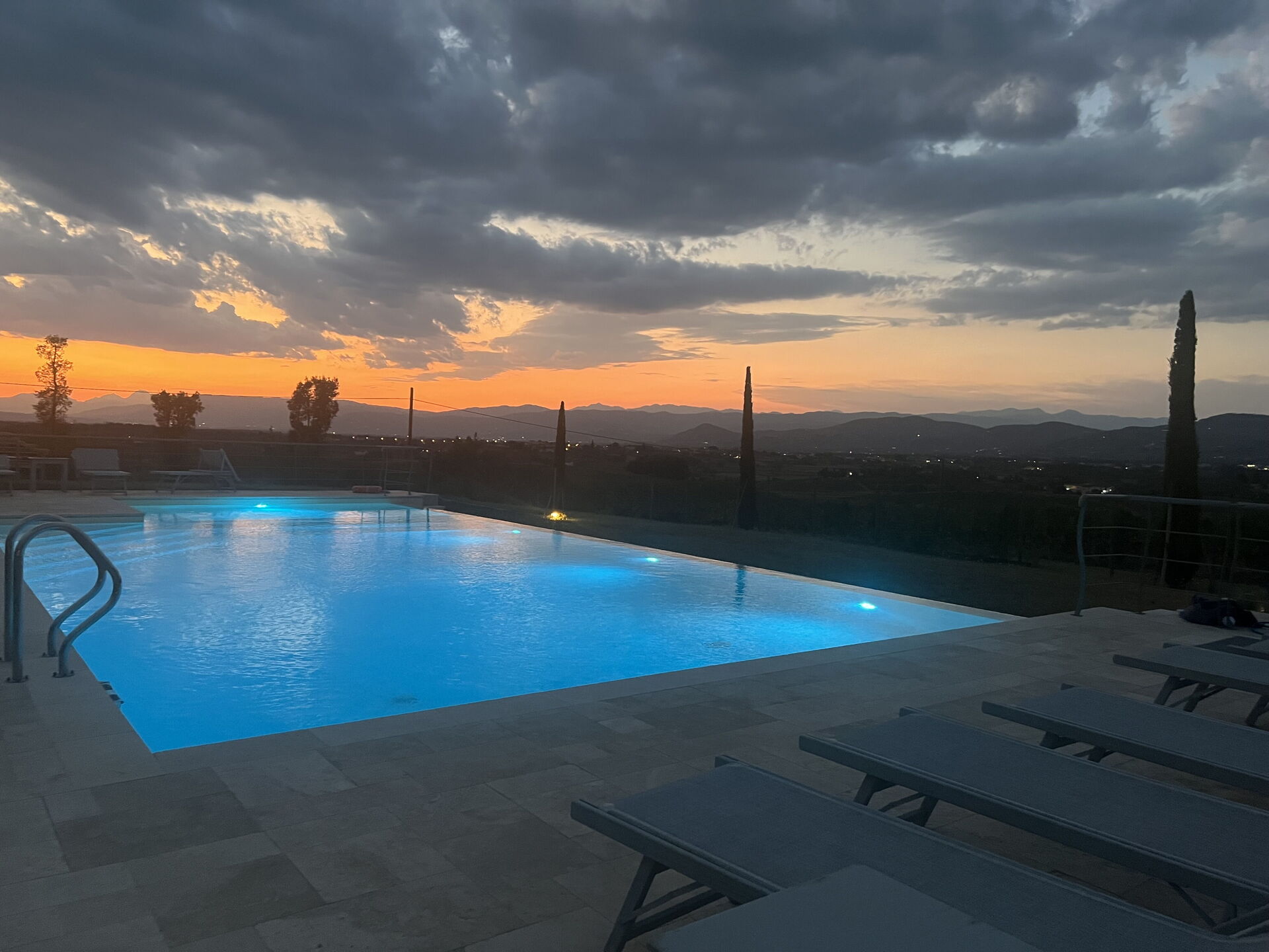 Man bor lidt op ad en bakke, så man har udsigten, både fra lejligheden og poolen, ud over bjergene, vinmarker og oliventræer. Der er rolig, og ingen larm og støj. Man har sin egne liggestole og pavillon. Det er den reneste pool, som vi har set. Værterne er super søde, nærværende og man føler sig meget velkommen, de kom ud og byd os velkommen på parkeringspladsen. De bor i samme bygning som lejlighederne, så det var nemt at få fat på dem, også på telefon. De var utrolig serviceminded, alt fra anbefalinger af restauranter, oplevelser, vinsmagning, hvad man skulle se i området osv. De bookede alle restaurant og oplevelser for os. Vi fik en privat rundvisning i deres vinmarker. Der er en køkkenhave, hvor man kan tage de friske grøntsager, alt efter sæsonen. Lejligheden var rent, og der er alt hvad man har brug for. Lejlighederne ligger udenfor byen, så man skal have en bil. Vi kan varmt anbefalede stedet, og det er nok heller ikke sidste gang, at vi kommer igen