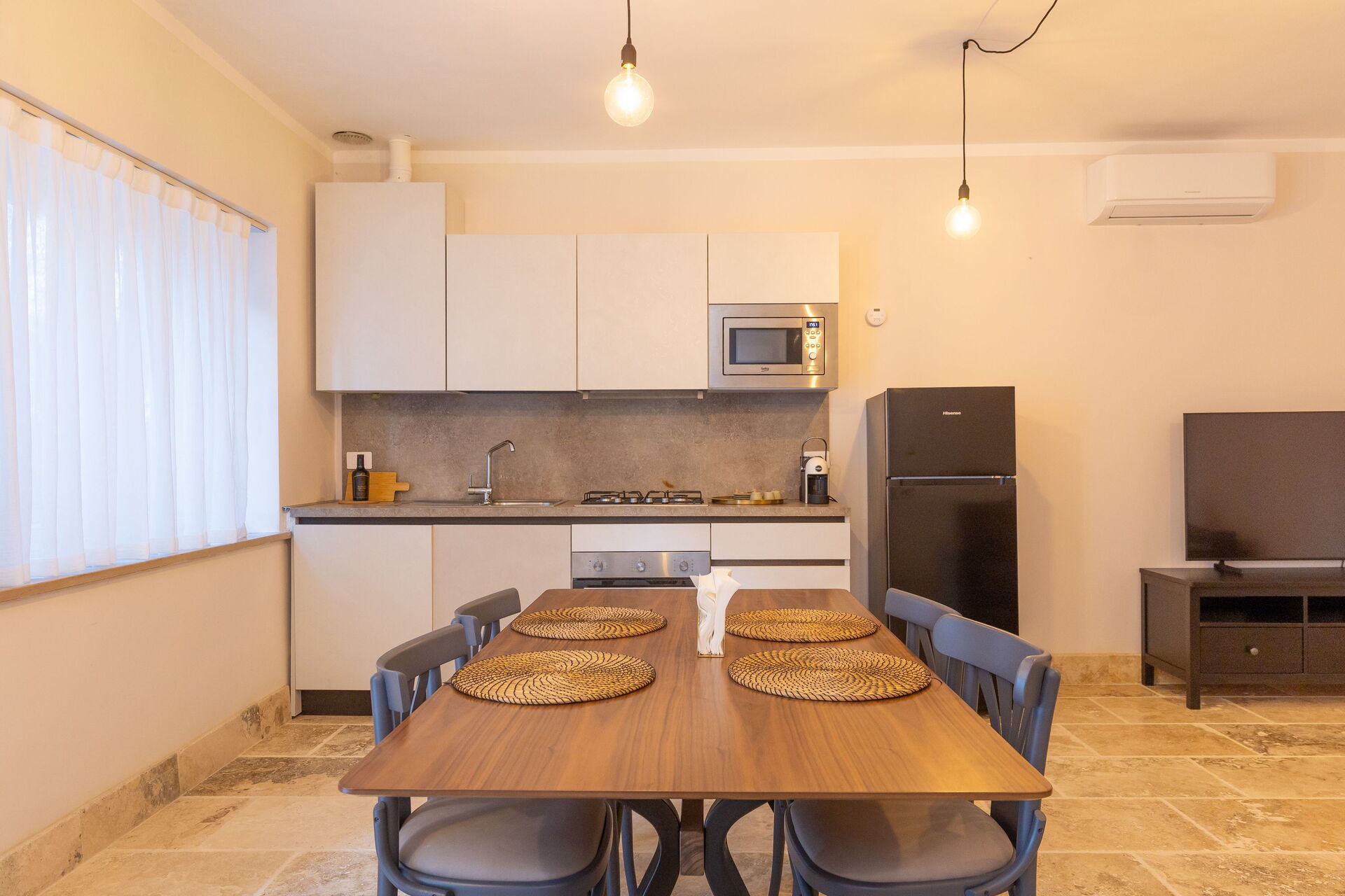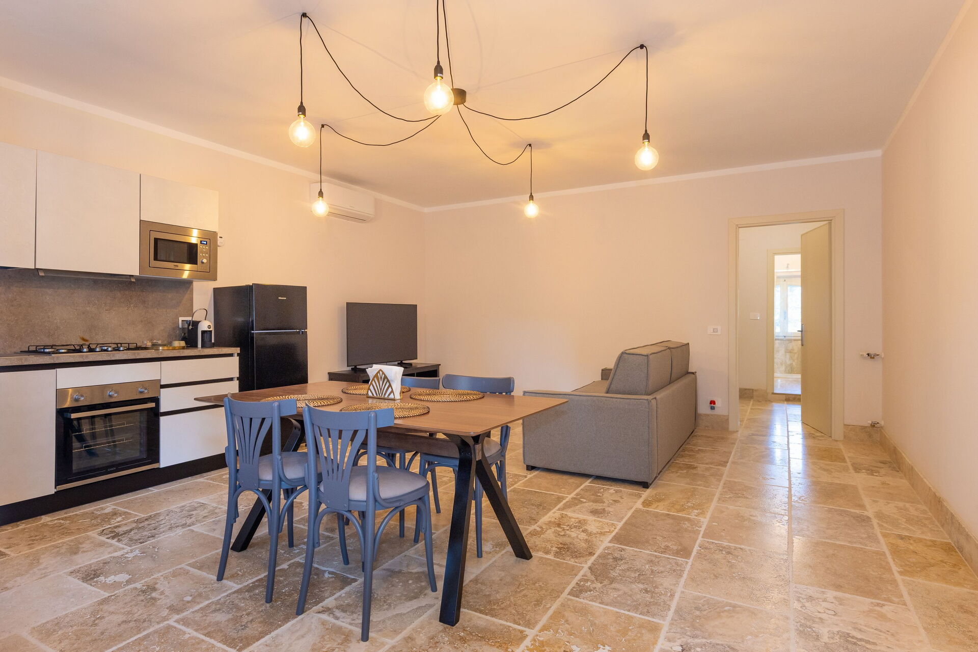 Verhoogde begane grond: woonkamer (smart-tv, airconditioning) met tweepersoons slaapbank, eethoek en open keuken (vaatwasser, oven, koelkast, espressomachine, broodrooster), tweepersoonsslaapkamer (airconditioning), badkamer met douche.