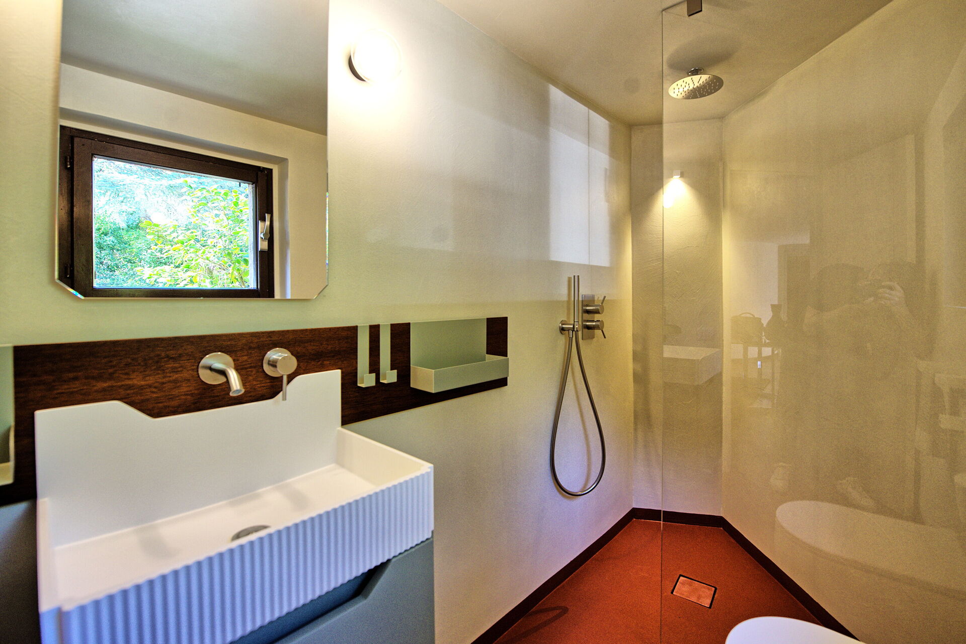 Een extra slaapkamer met tweepersoonsbed (hoog raam) met douche is 50 meter onder het zwembad niveau.