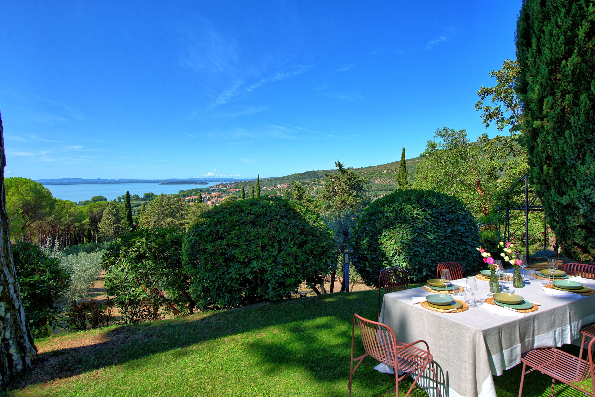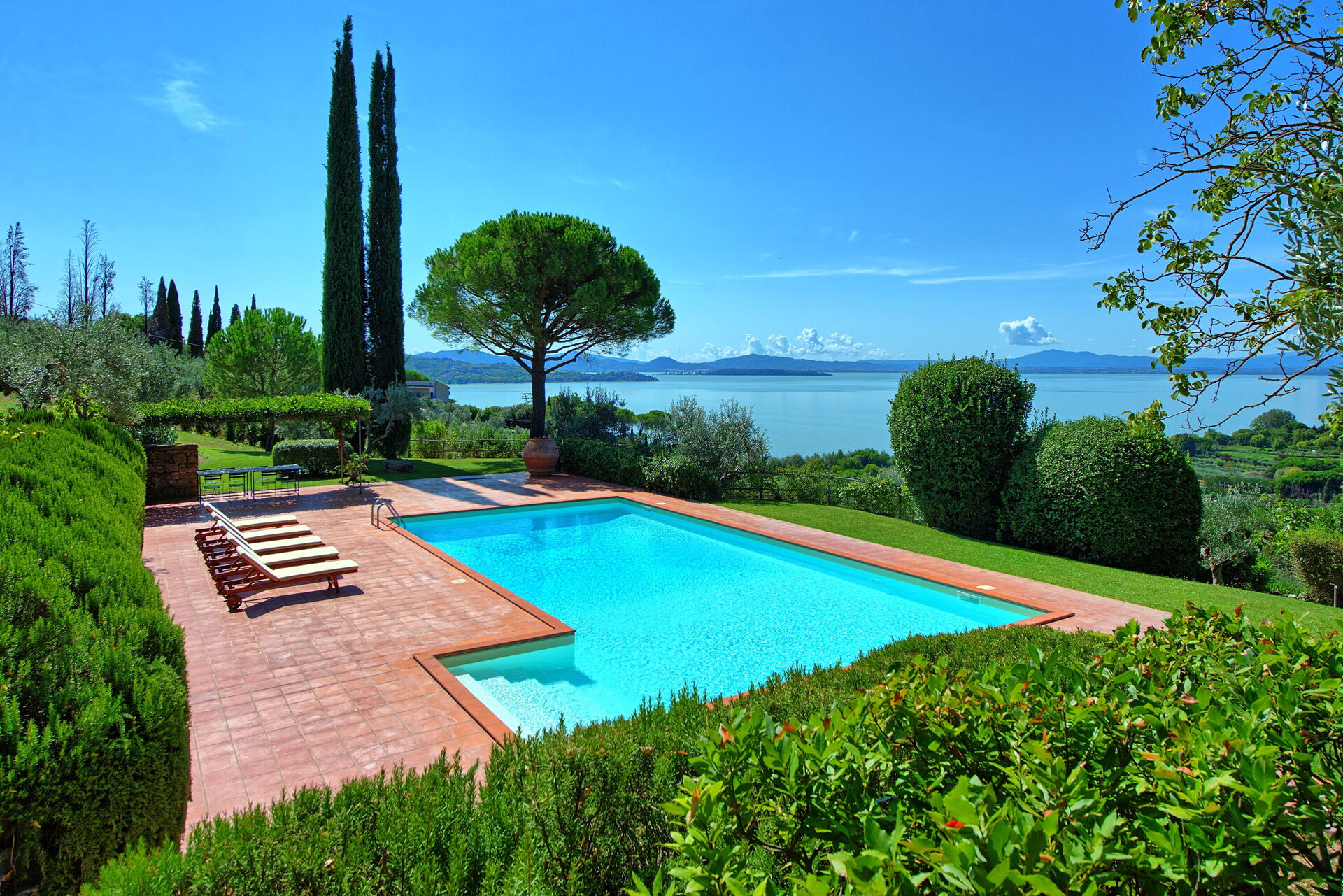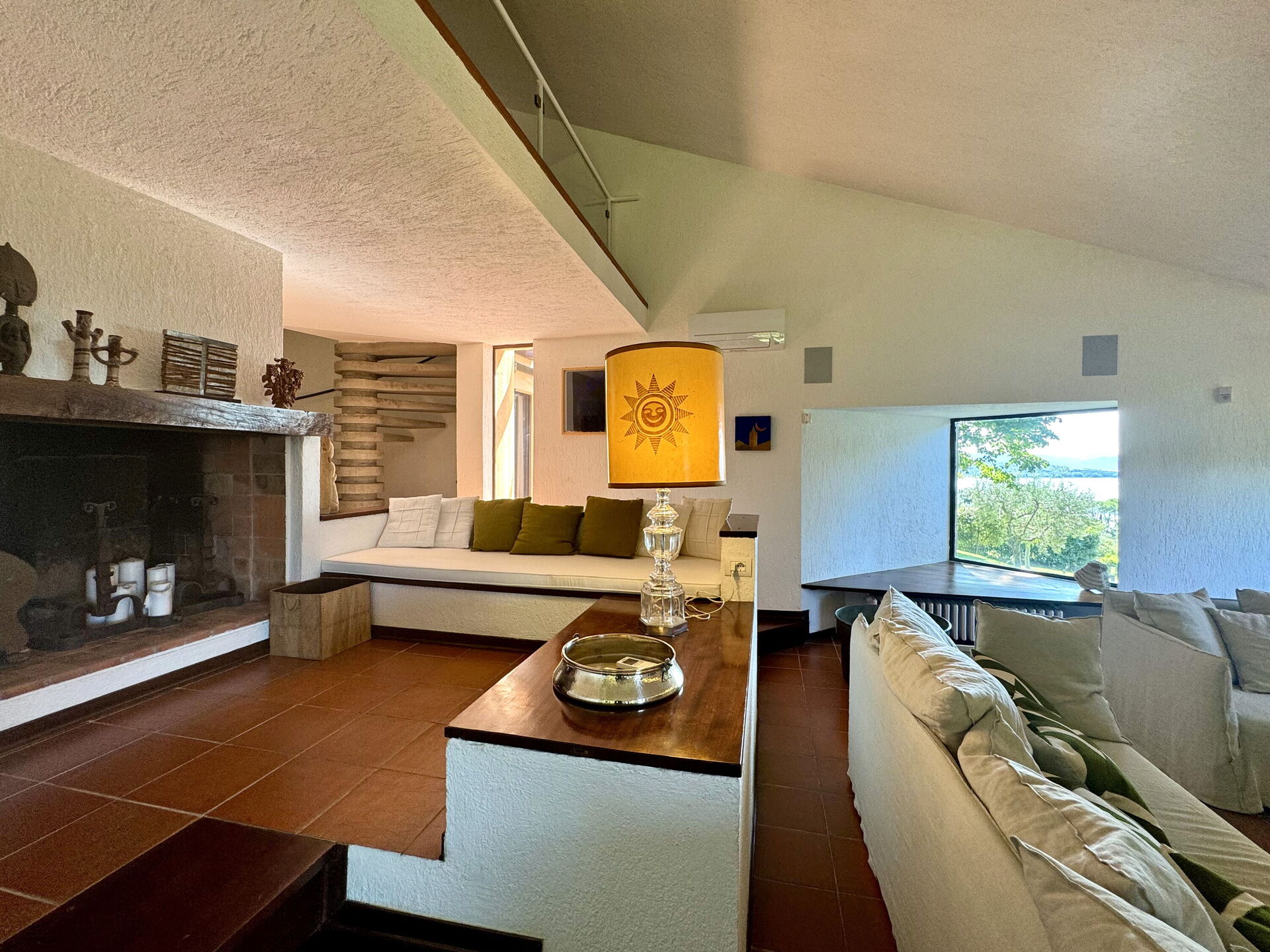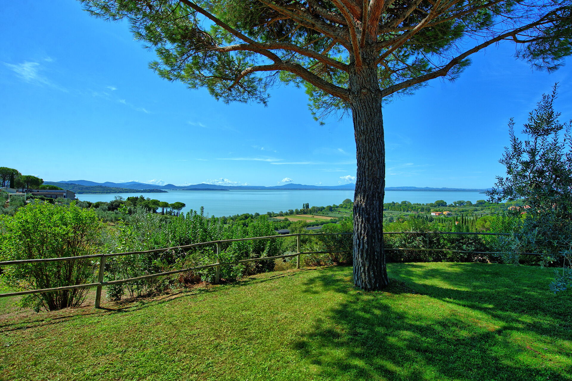 Originele villa gebouwd in 1973 (destijds gepubliceerd in het tijdschrift "Ville en Giardini"), met prachtig grote ramen en terrassen. Gelegen op de helling van een heuvel in de buurt van het meer van Trasimeno, met prachtig uitzicht over dit meer, de eilanden en de glooiende groene heuvels van Umbrië in de verte. Het interieur is gastvrij en in jaren 70 stijl ingericht (de onderste verdieping is eenvoudiger). Buiten is een grote terrasvormige tuin met zwembad en een mooie pergola met barbecue. Deze villa ligt op de grens tussen Toscane en Umbrië en biedt gemakkelijke toegang tot de belangrijkste kunststeden van beide regio's zoals Perugia, Assisi, Arezzo, Montepulciano, Cortona en ook het charmante middeleeuwse dorp Passignano. Het meer van Trasimeno (met stranden) ligt op 2 km afstand en biedt de mogelijkheid om te windsurfen, vissen en zeilen. De snelweg die Siena naar Perugia verbindt, ligt op ongeveer 500m van het huis maar is lager gelegen waardoor het geluid nihil is. De toegang tot de woning is via een smalle weg van ca. 1200m welke . De laatste 300 meter is onverhard.