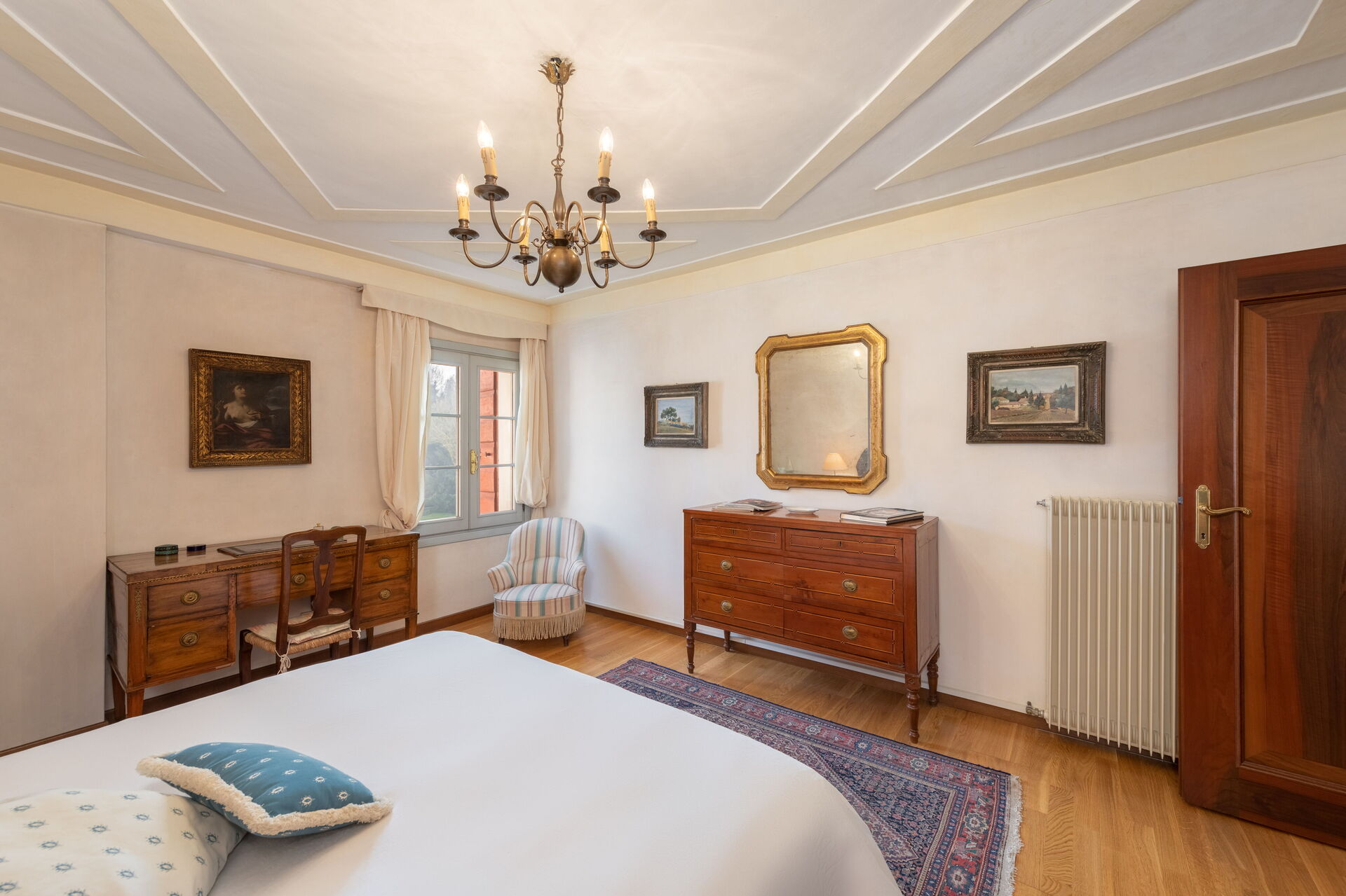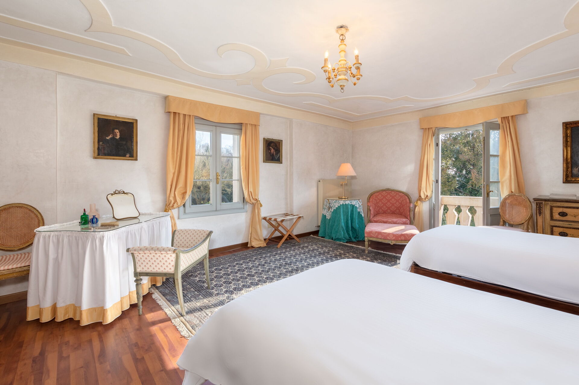 De 3e deur leidt naar een zitkamer met bank en bureau die leidt naar de laatste slaapkamer, een grote kamer met 2 aparte bedden, fauteuil, 3 stoelen en 2 ladekasten. Deze 2 slaapkamers delen een badkamer (ligbad/vaste douchekop) die bereikbaar is via de zitkamer. Alle ramen op de bovenverdieping kijken uit op de grote tuin in Italiaanse stijl en de gevel van de villa.