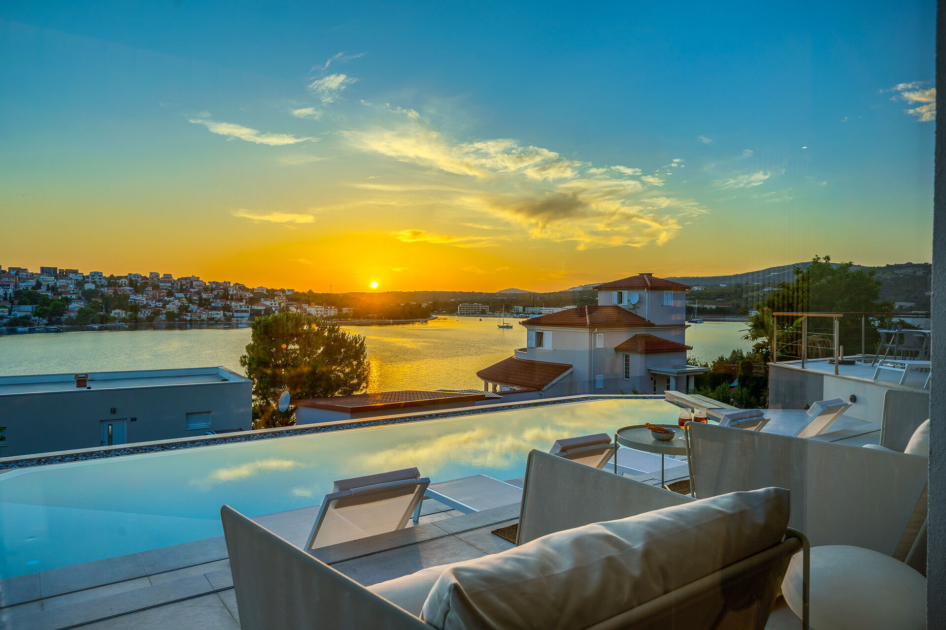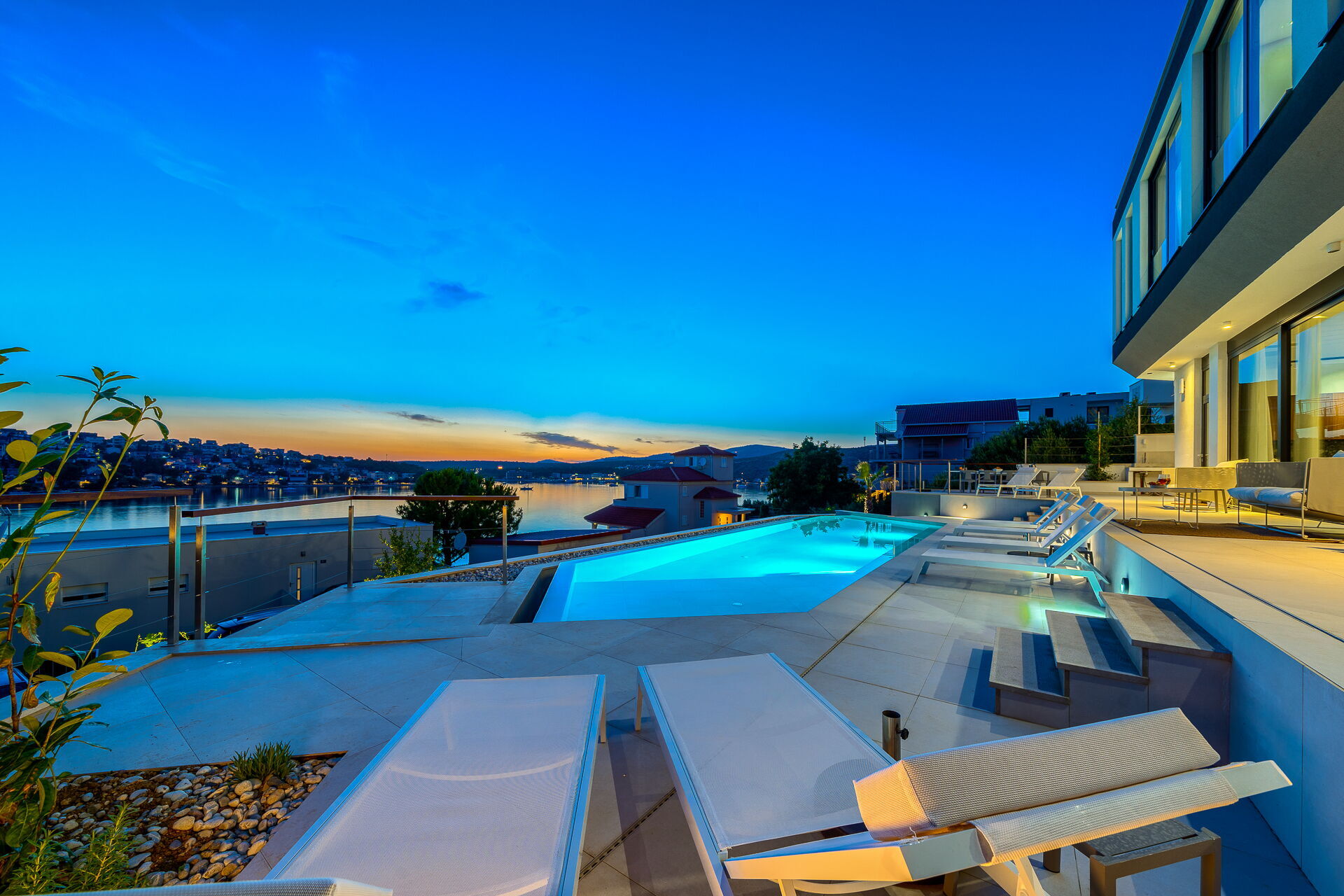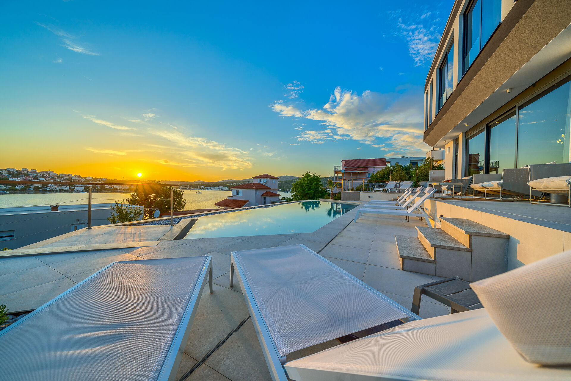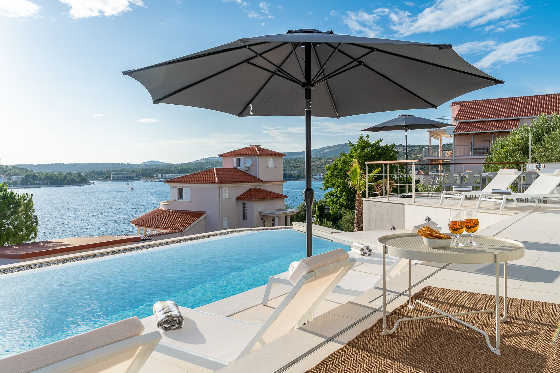 Op de eerste verdieping van Villa Allina met twee verdiepingen is er een fantastisch zonneterras met een elegant verwarmd zwembad, waar u kunt genieten van betoverende zonsondergangen over de zee.