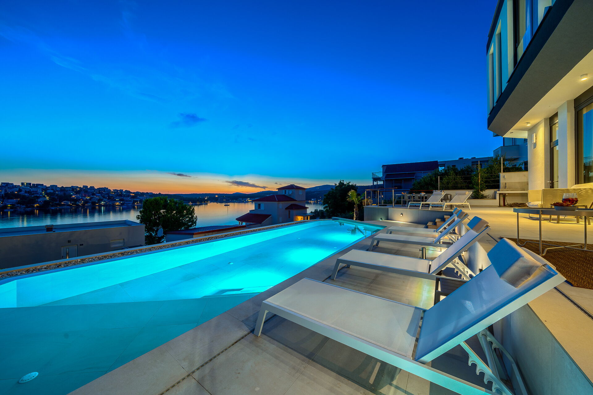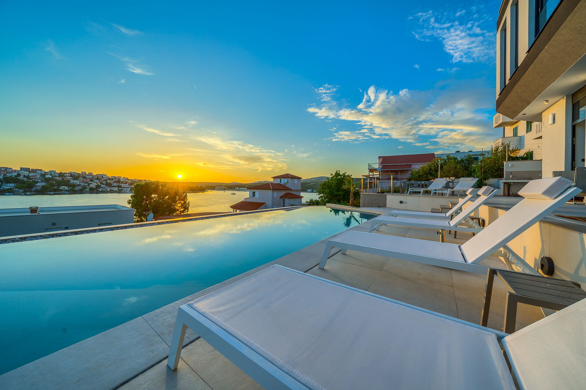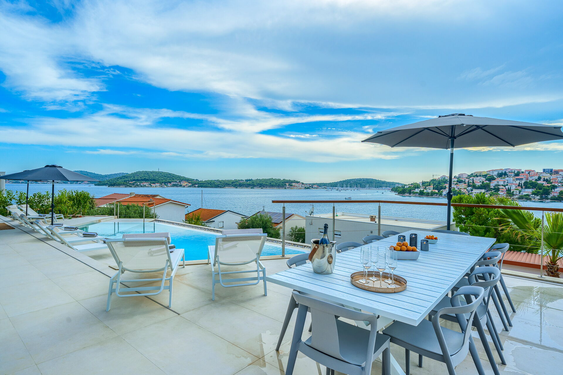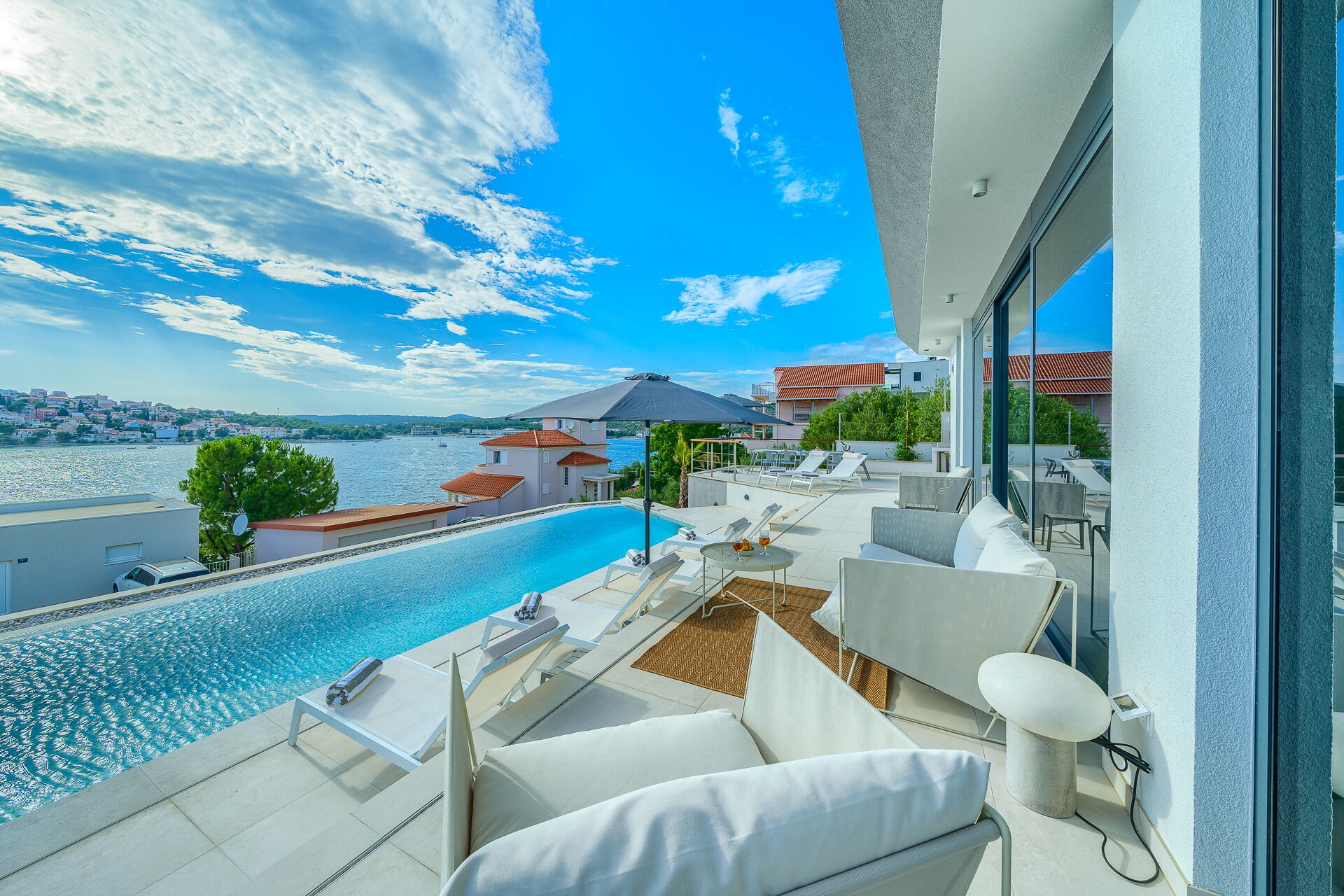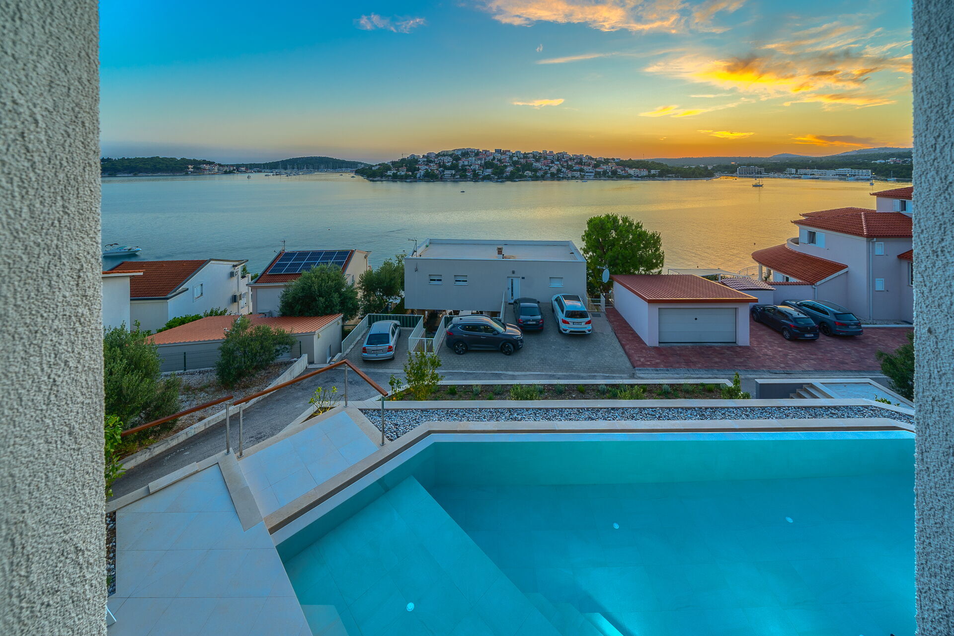 Op de eerste verdieping van Villa Allina met twee verdiepingen is er een fantastisch zonneterras met een elegant verwarmd zwembad, waar u kunt genieten van betoverende zonsondergangen over de zee.