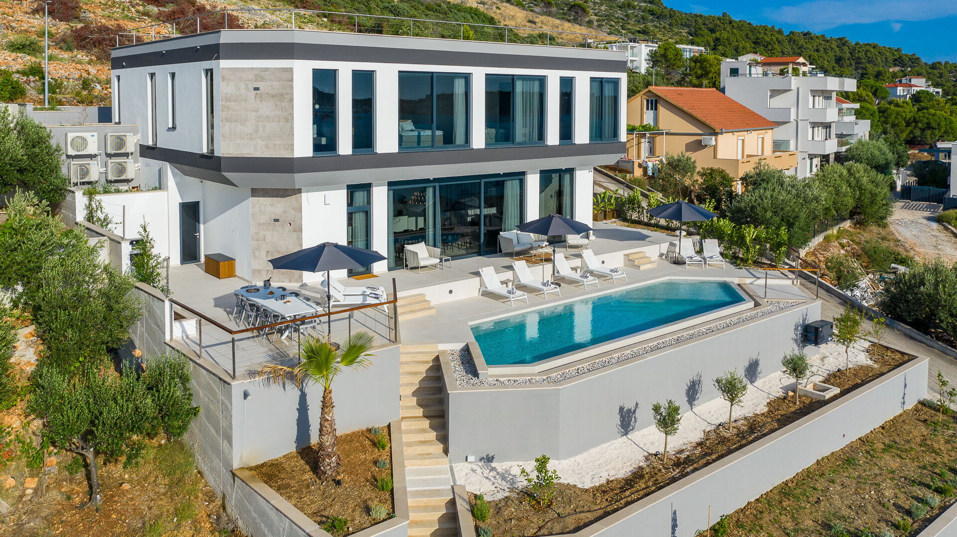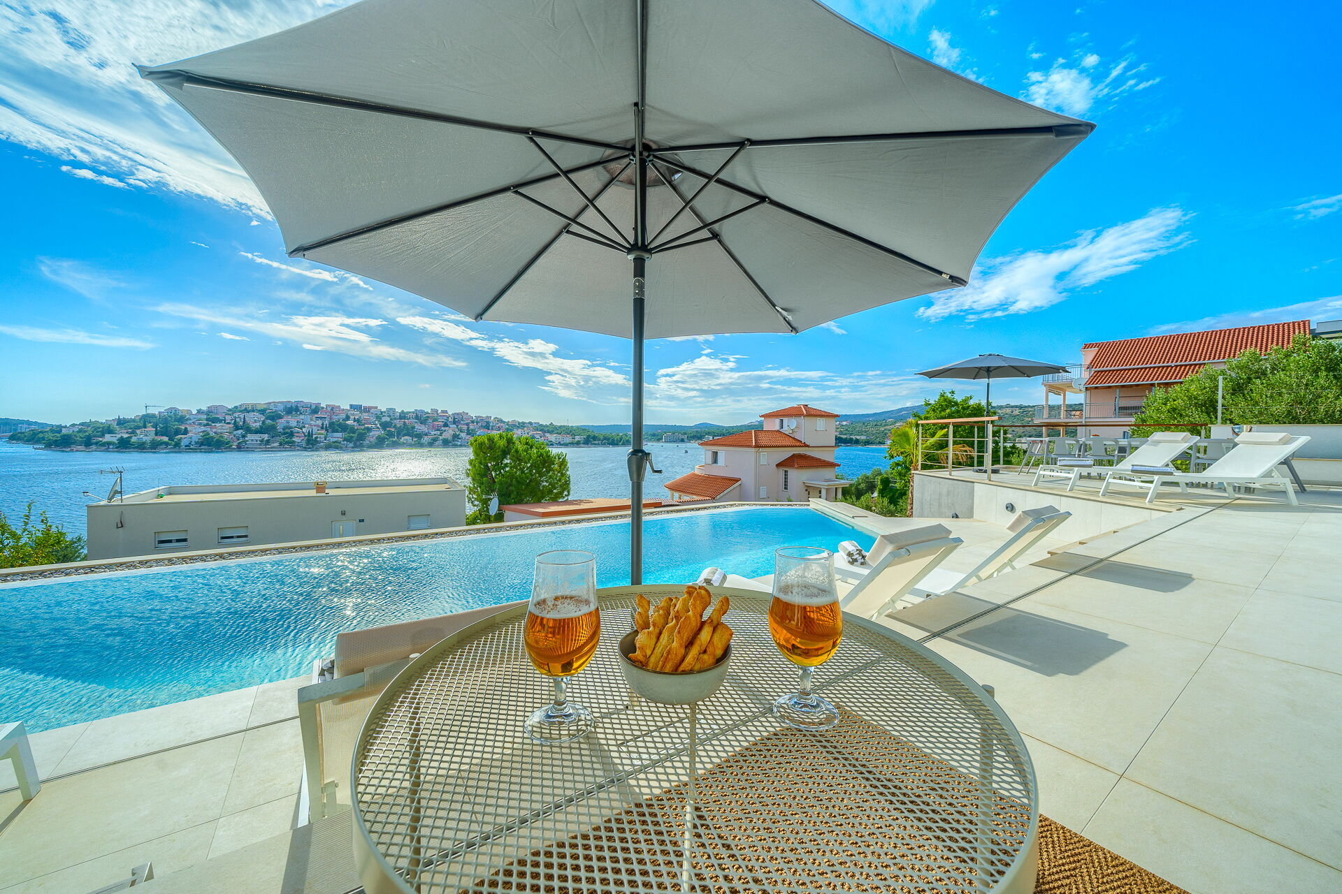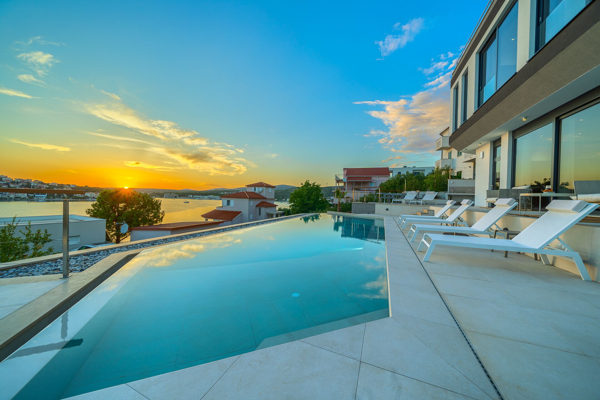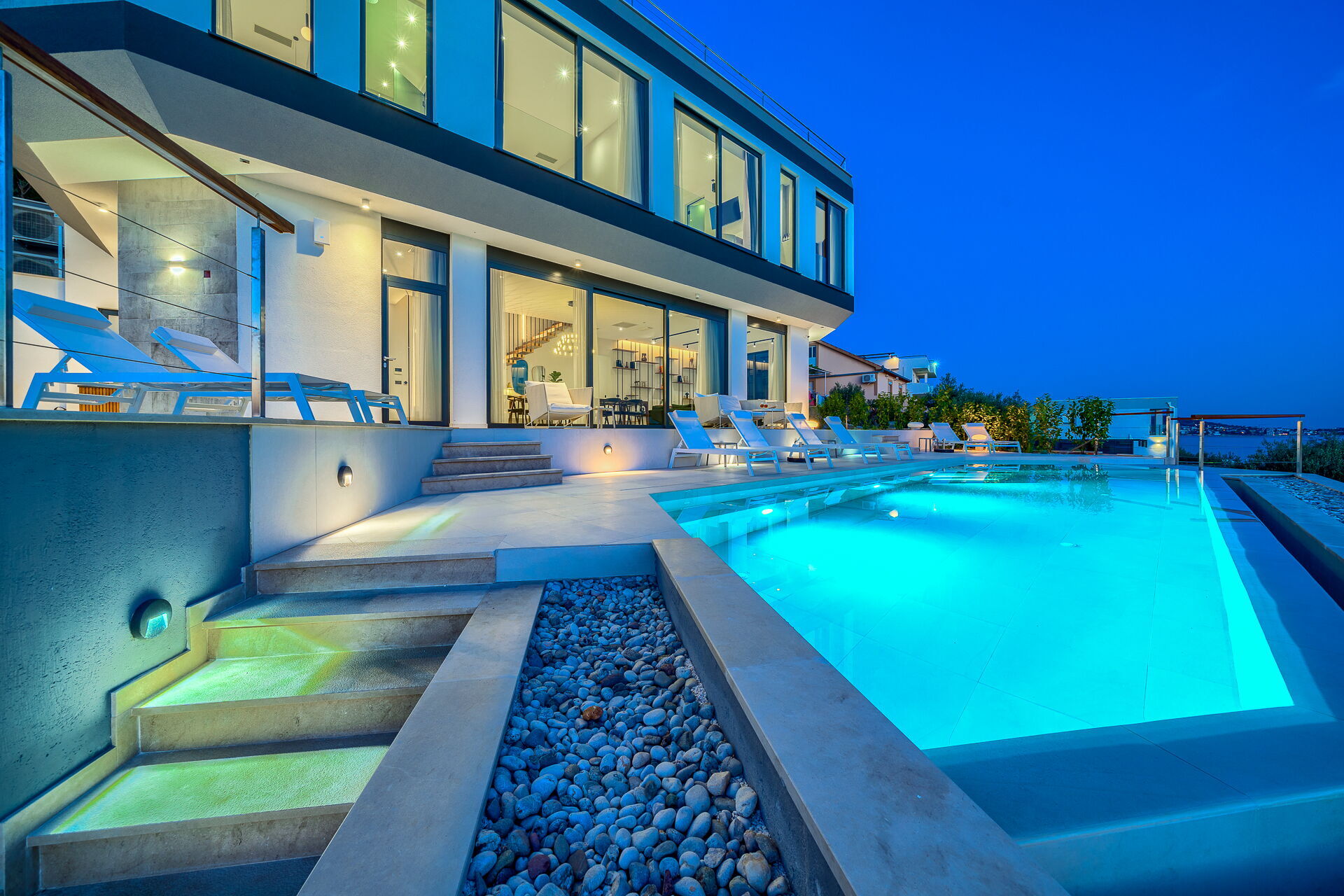 Op de eerste verdieping van Villa Allina met twee verdiepingen is er een fantastisch zonneterras met een elegant verwarmd zwembad, waar u kunt genieten van betoverende zonsondergangen over de zee.