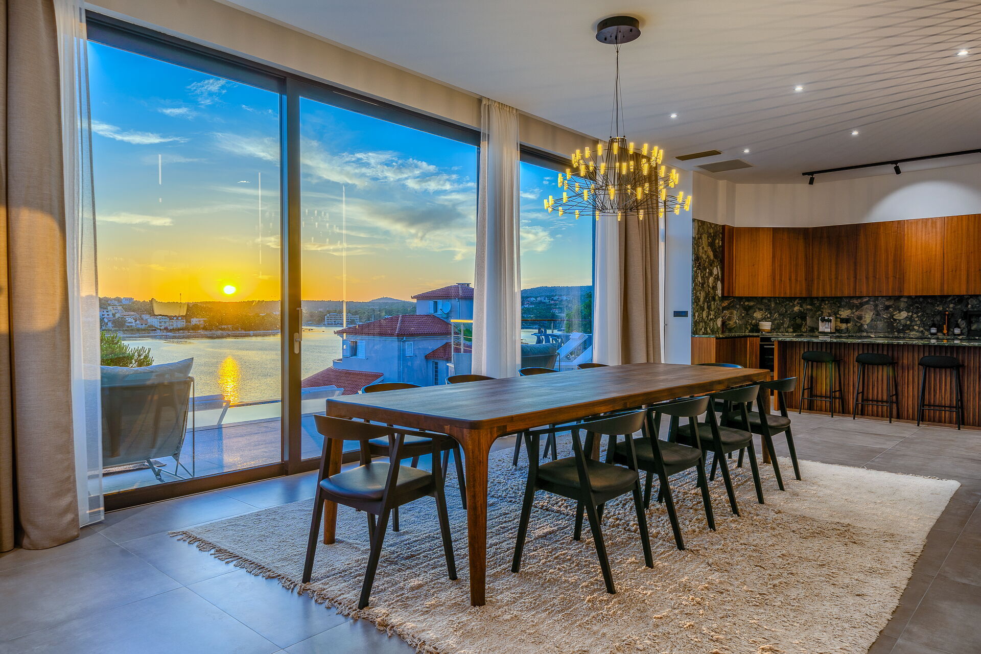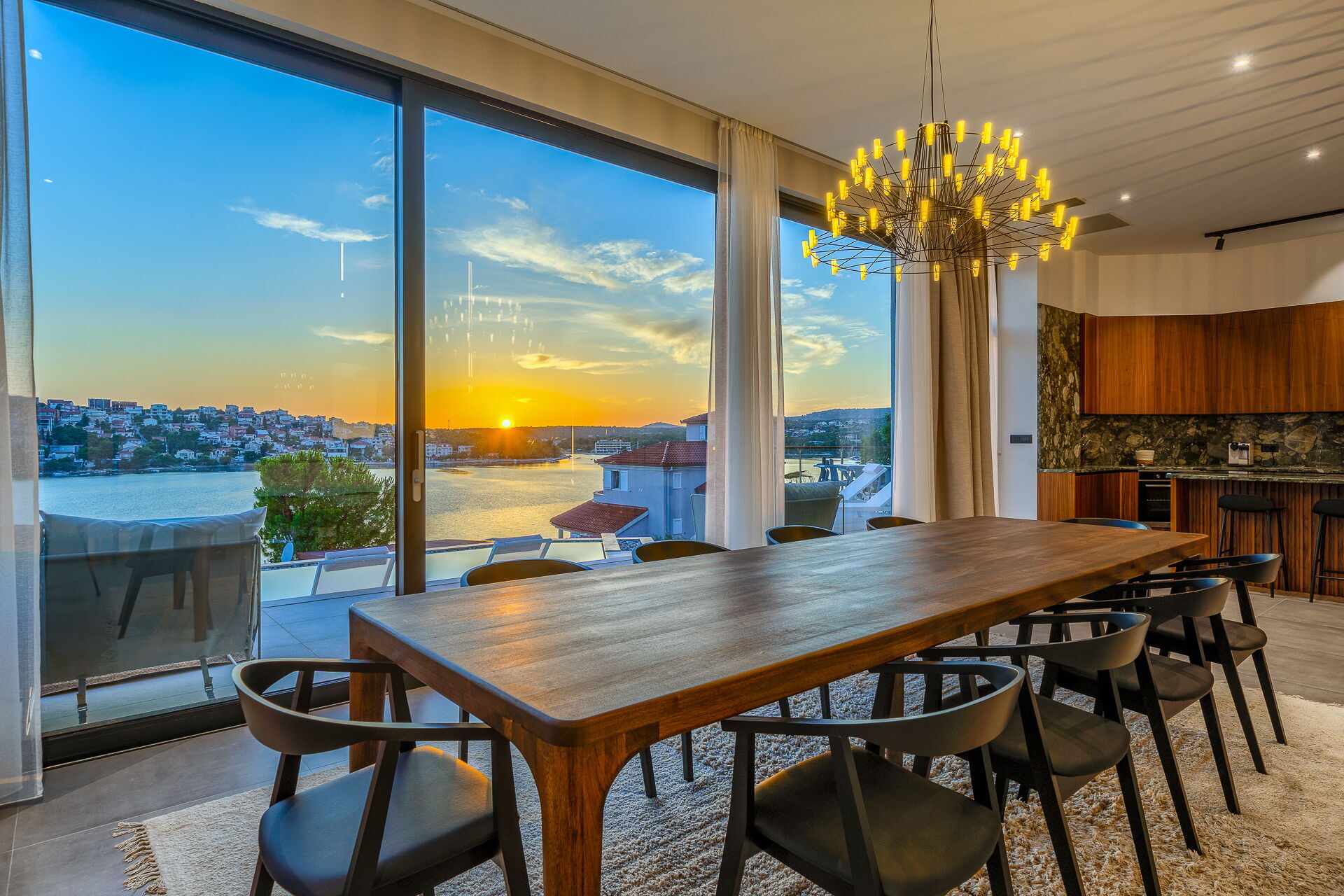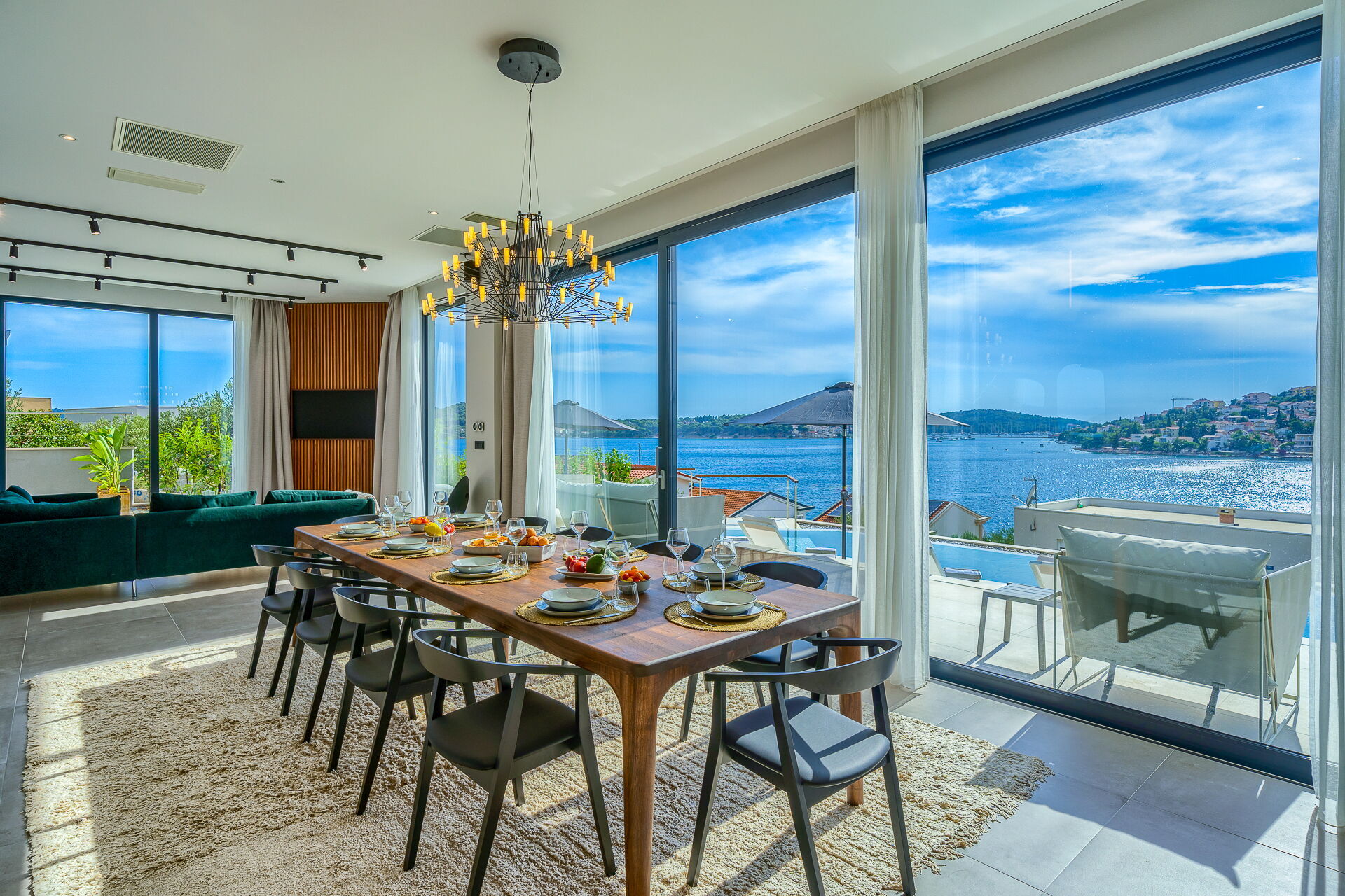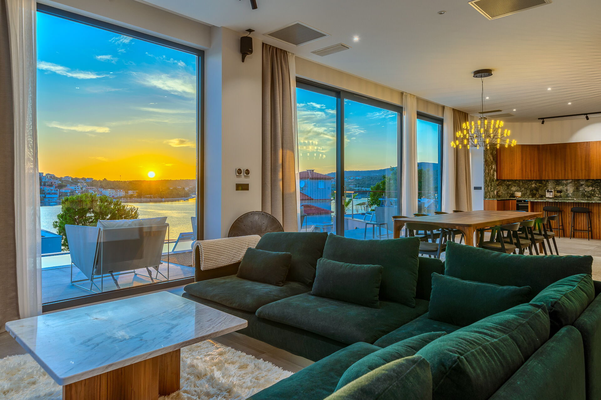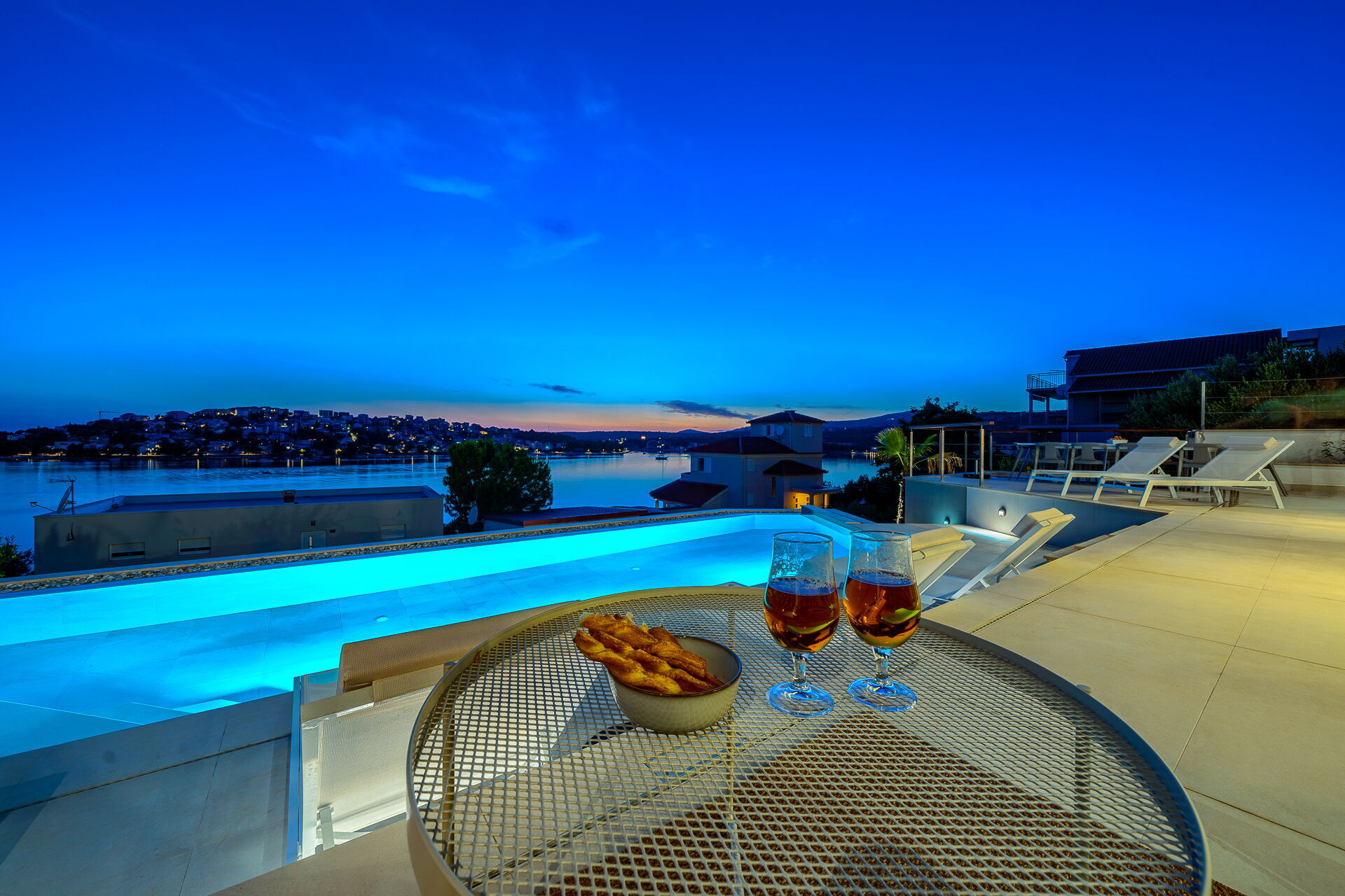 Op de eerste verdieping van Villa Allina met twee verdiepingen is er een fantastisch zonneterras met een elegant verwarmd zwembad, waar u kunt genieten van betoverende zonsondergangen over de zee.