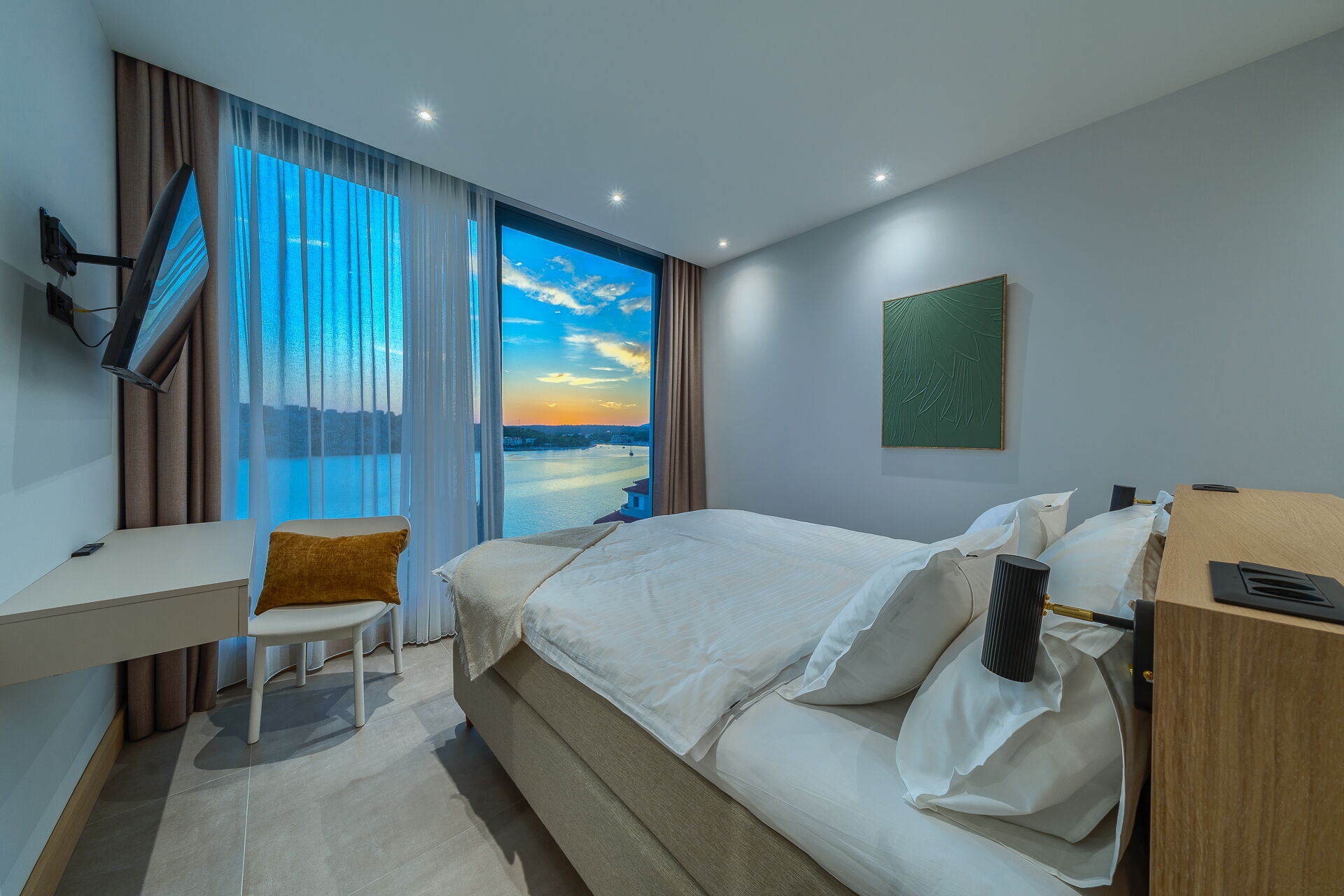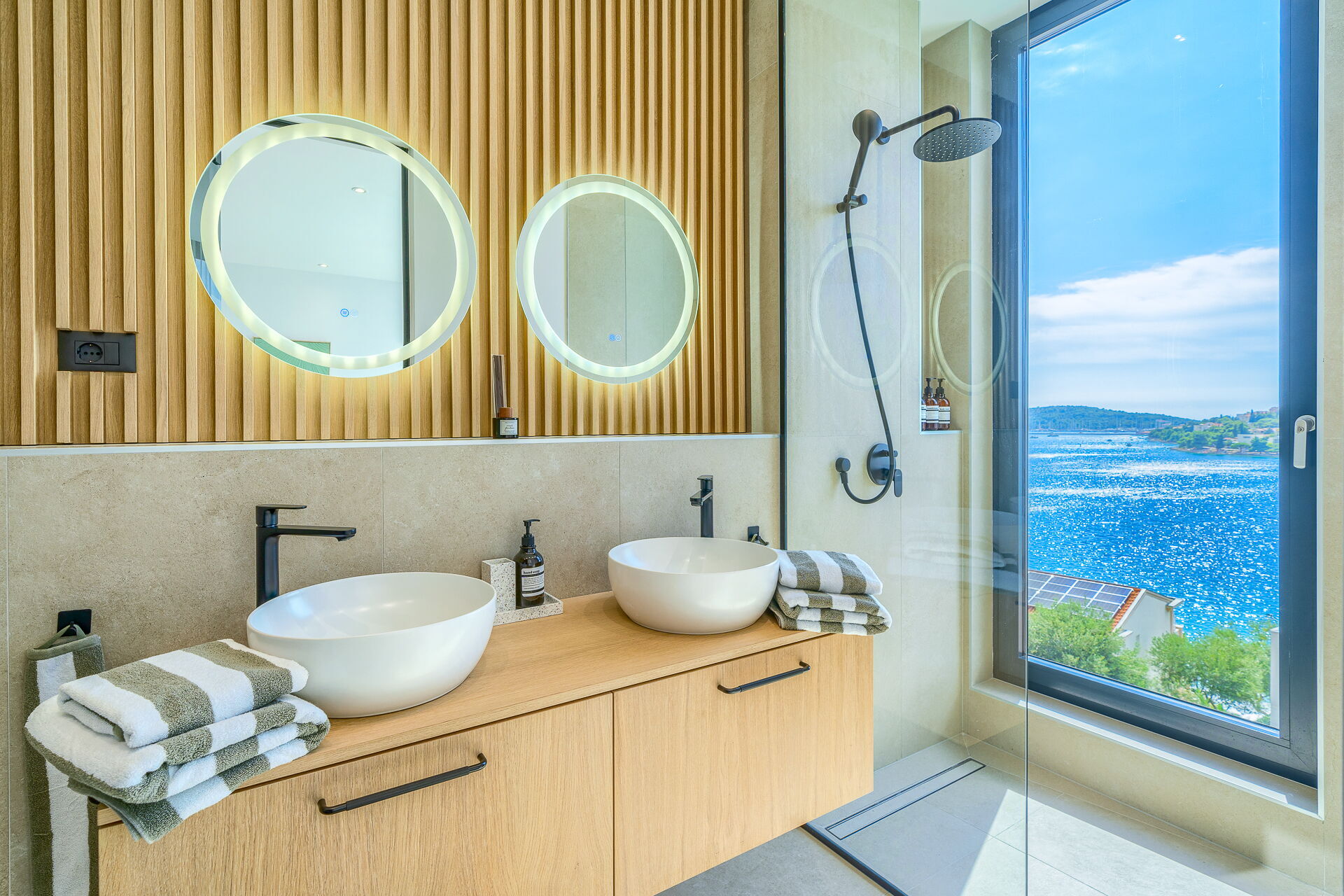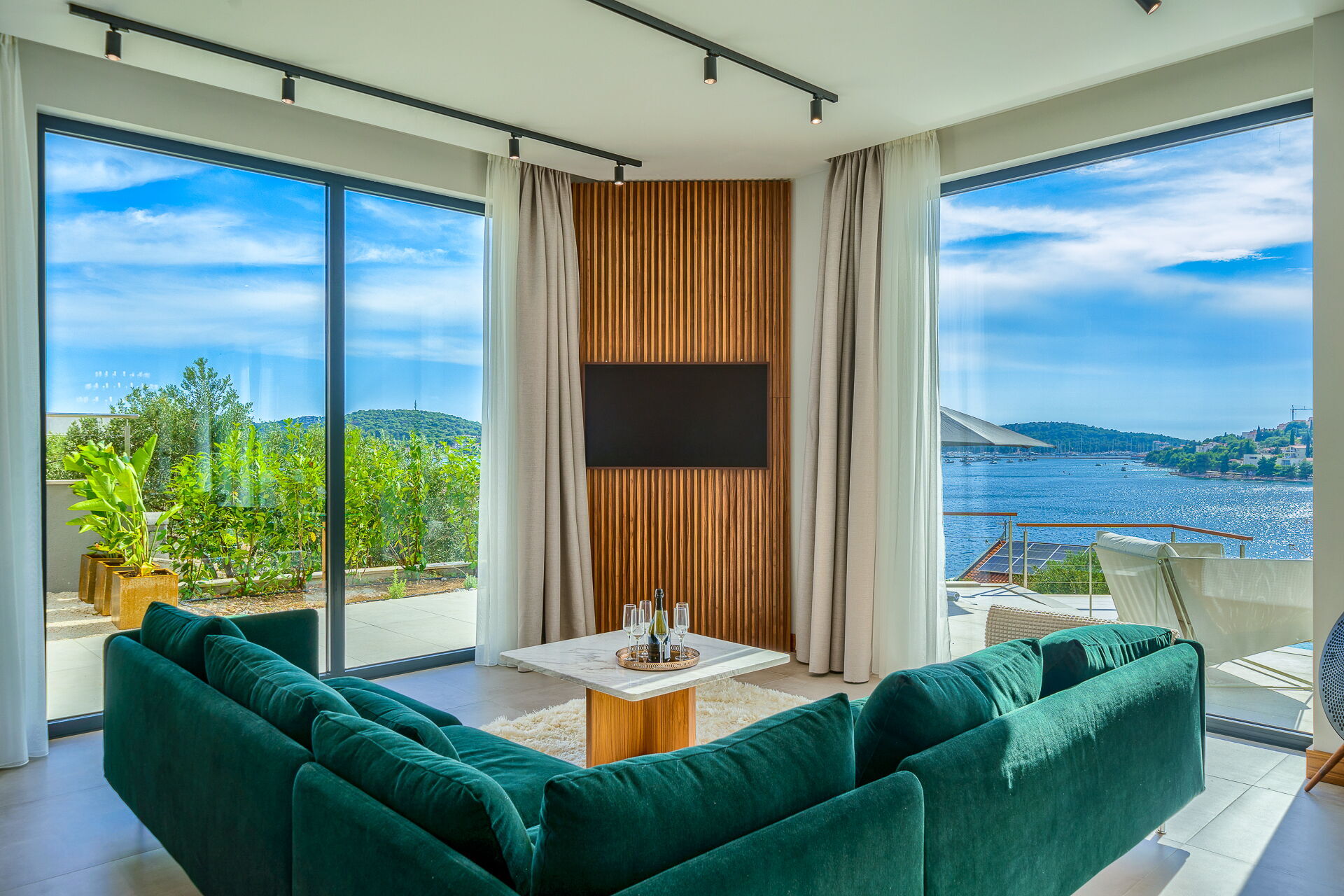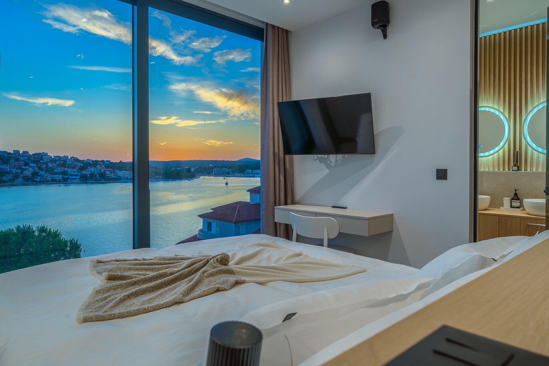 Op de eerste verdieping van Villa Allina met twee verdiepingen is er een fantastisch zonneterras met een elegant verwarmd zwembad, waar u kunt genieten van betoverende zonsondergangen over de zee.