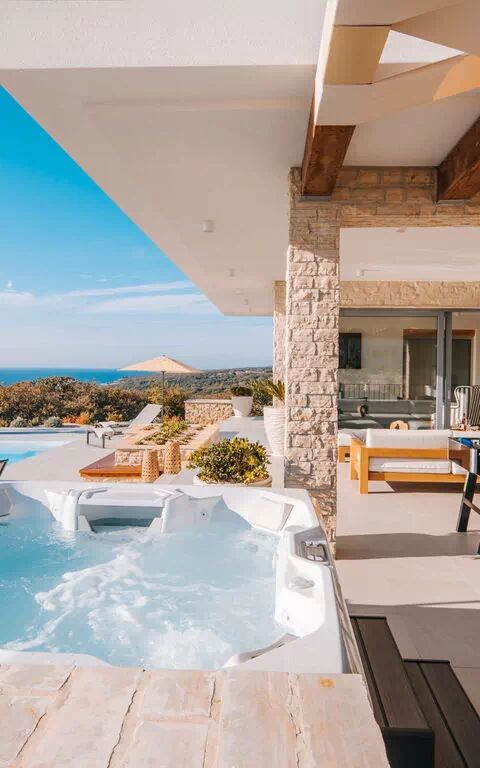 Deze betoverende villa heeft niet alleen een fantastisch uitzicht op de zee en het omliggende landschap, het is ook een ontspannende en rustige plek voor uw vakantie. Er is een mooi zwembad bij een groot terras met ligstoelen, en een buitenbubbelbad waar u kunt genieten van mooie dagen buiten.