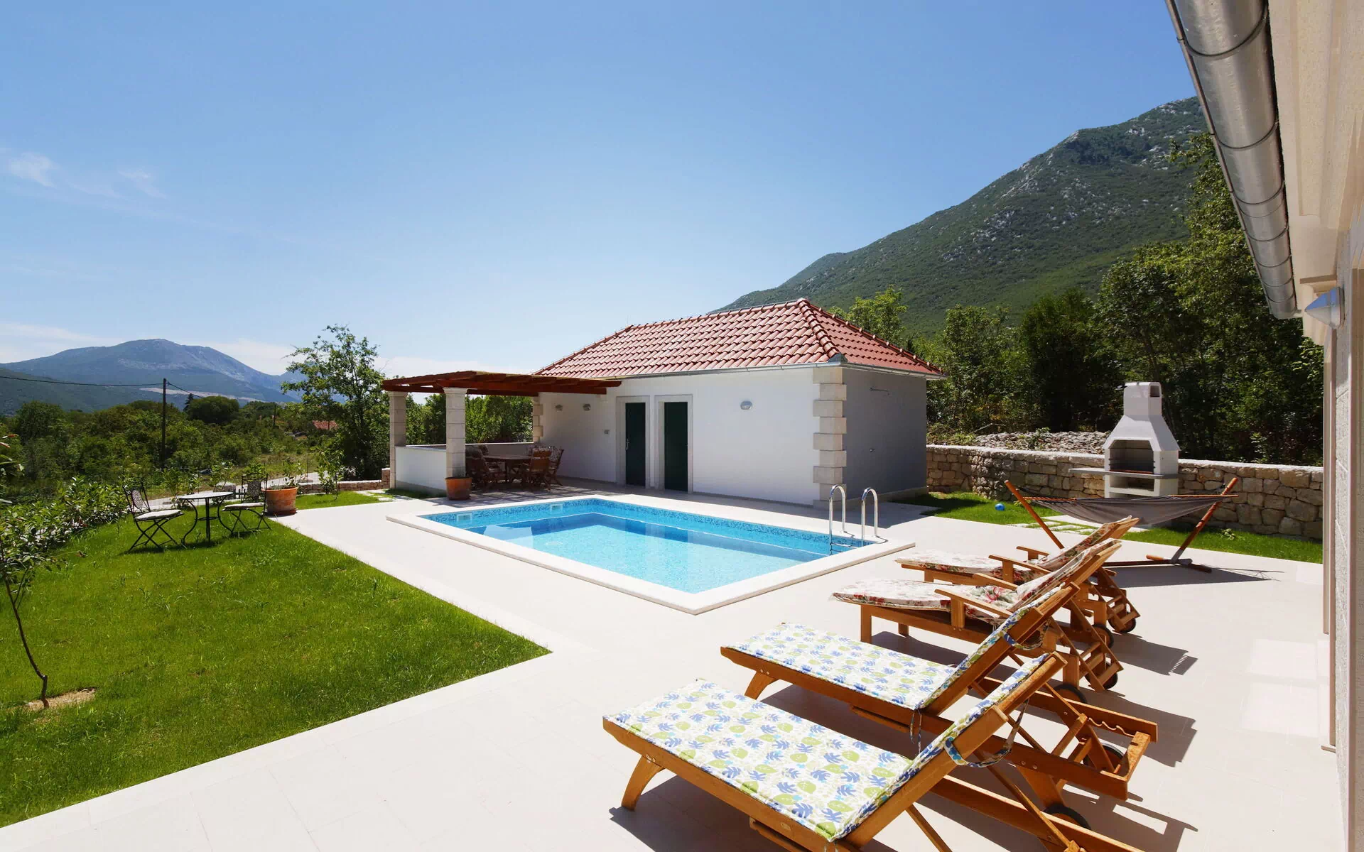 Buiten is er een mooi zwembad met een zonnedek en ligstoelen, evenals een stenen barbecue en een handige overdekte veranda met tafel en stoelen om buiten te eten: alles is omgeven door een goed onderhouden gazon.