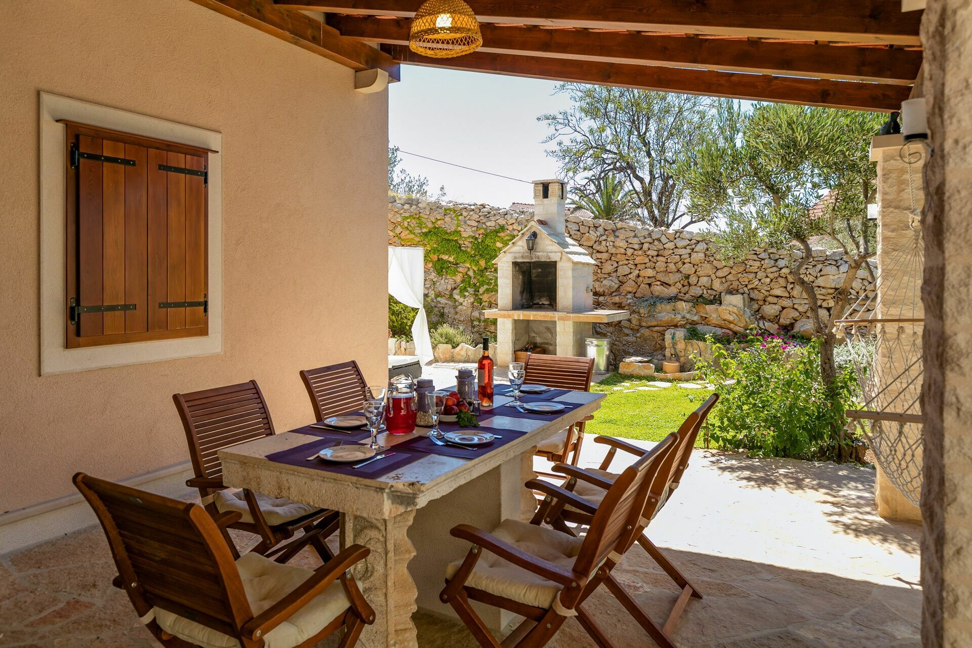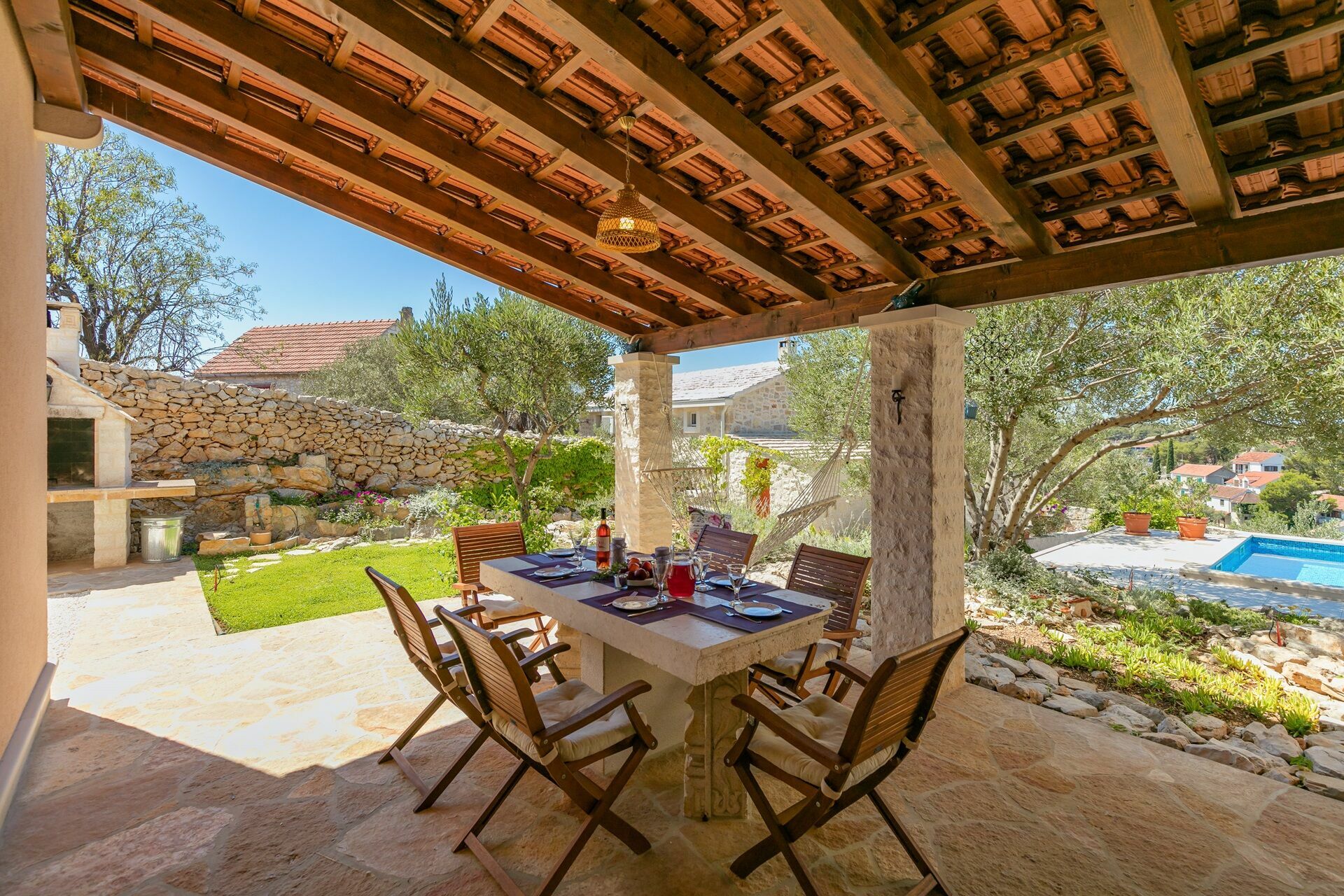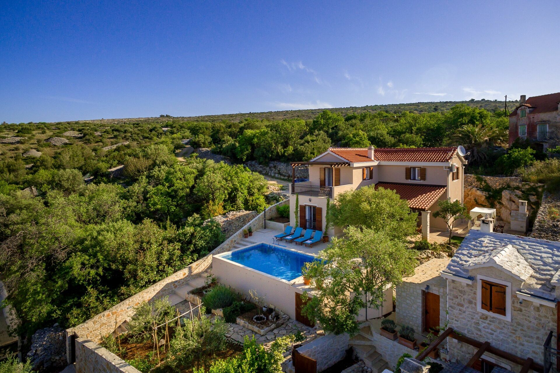 Deze prachtige villa is omgeven door een prachtige tuin met meerdere niveaus en biedt een privézwembad met ligstoelen en parasols: de ideale plek om te ontspannen met familie en vrienden. Onder de portiek is er een eethoek in de openlucht waar u buiten kunt eten en kunt genieten van een adembenemend uitzicht op de baai van Milna.