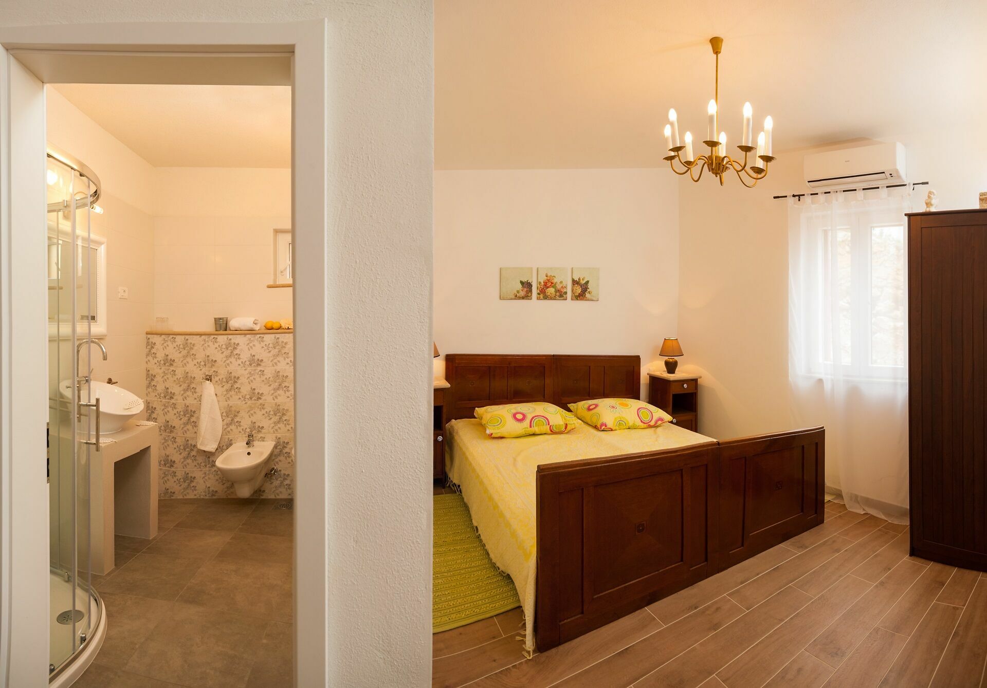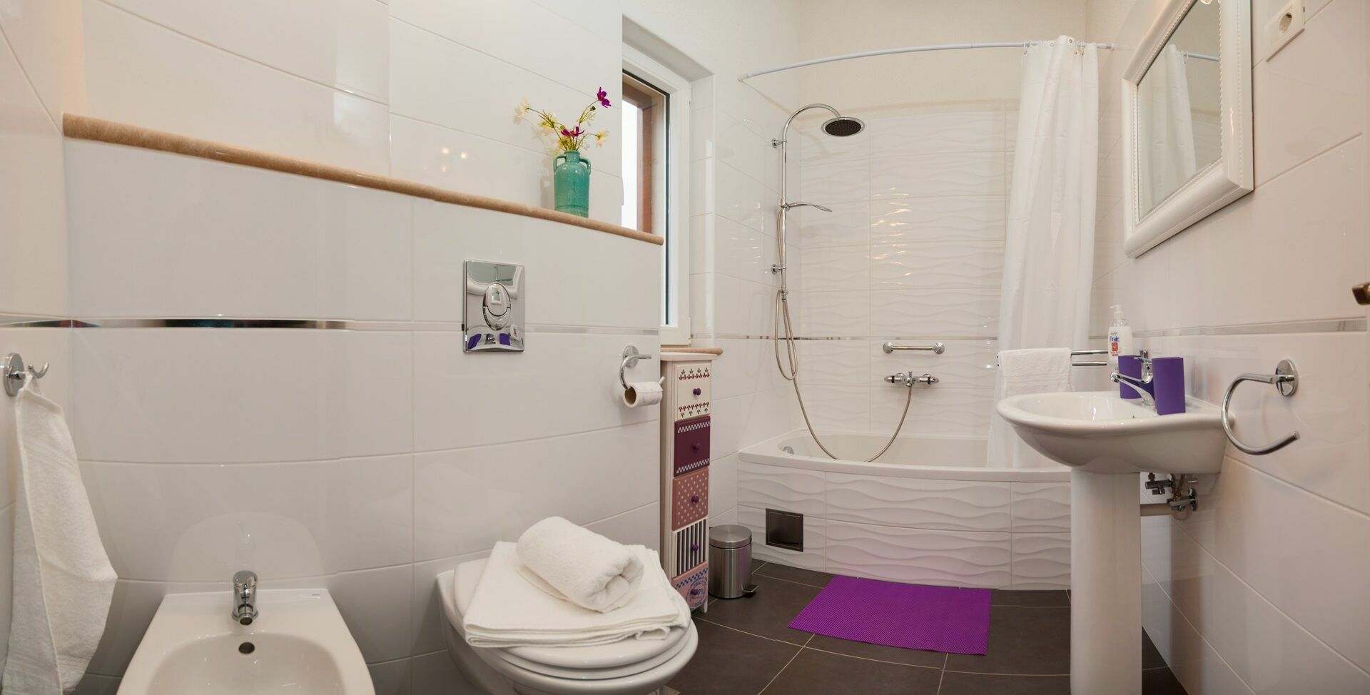 Woonkamer met eethoek en keuken; 2 dubbele slaapkamers, elk met eigen badkamer met douche; slaapkamer met 2 enkele bedden en eigen badkamer met ligbad.