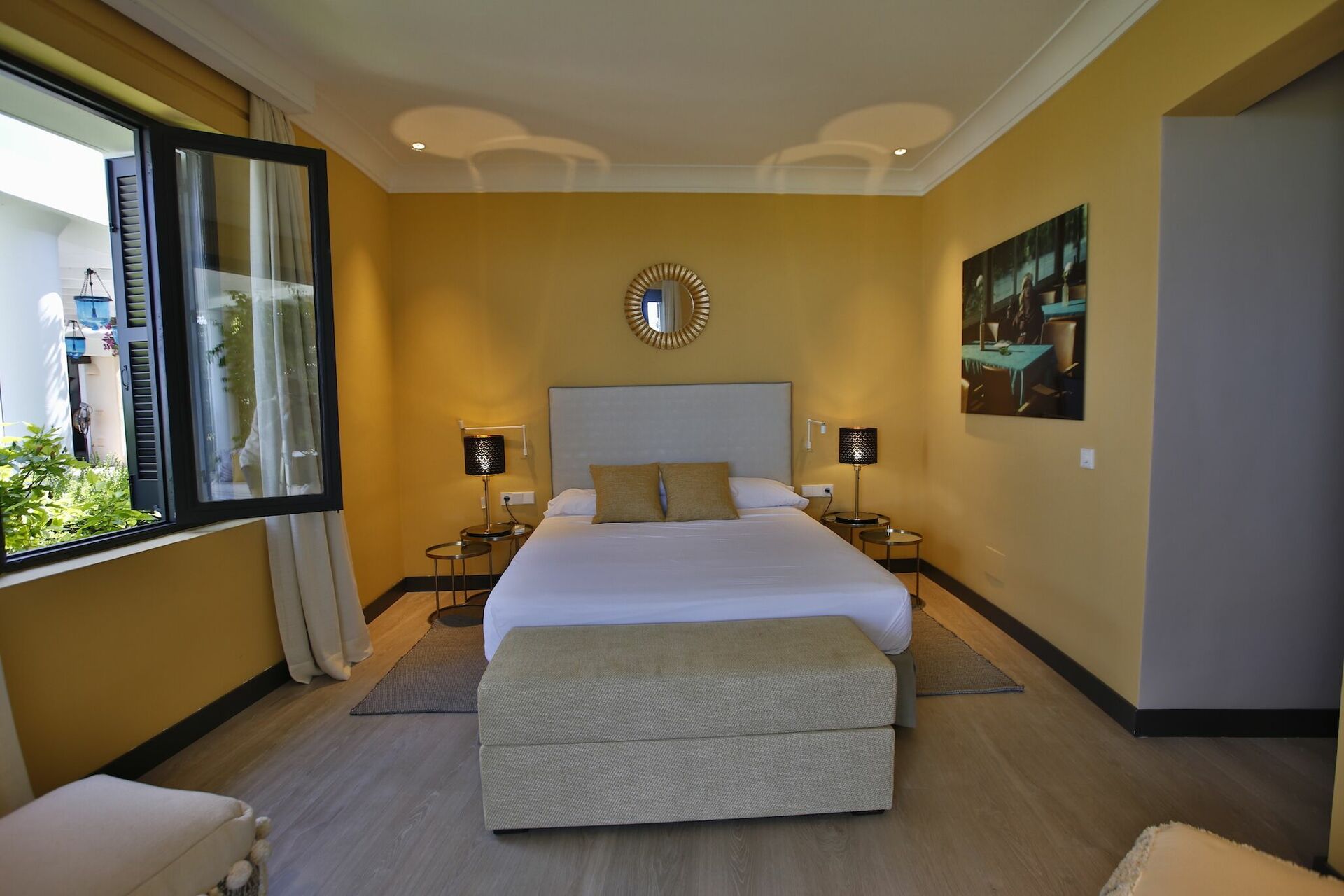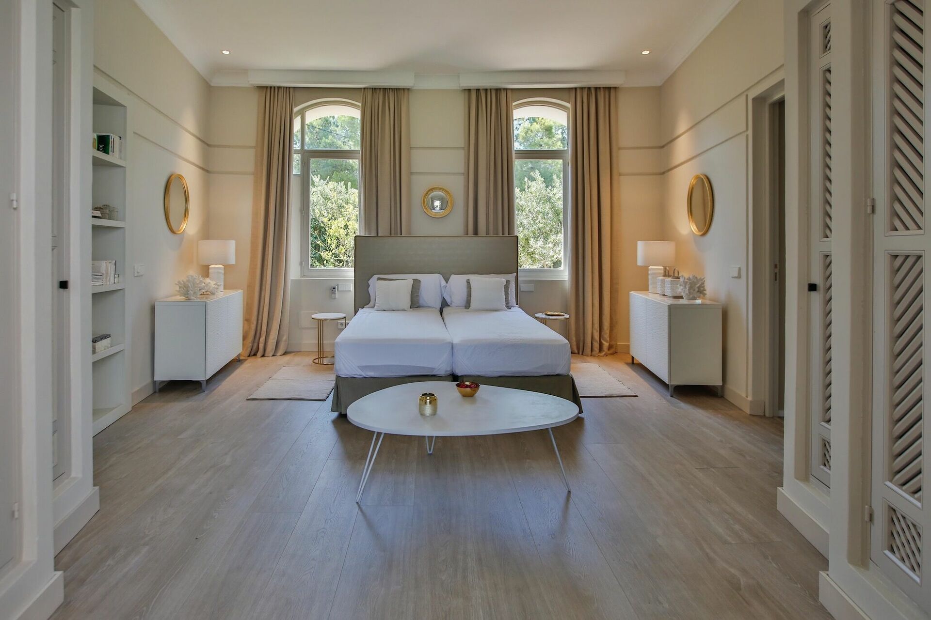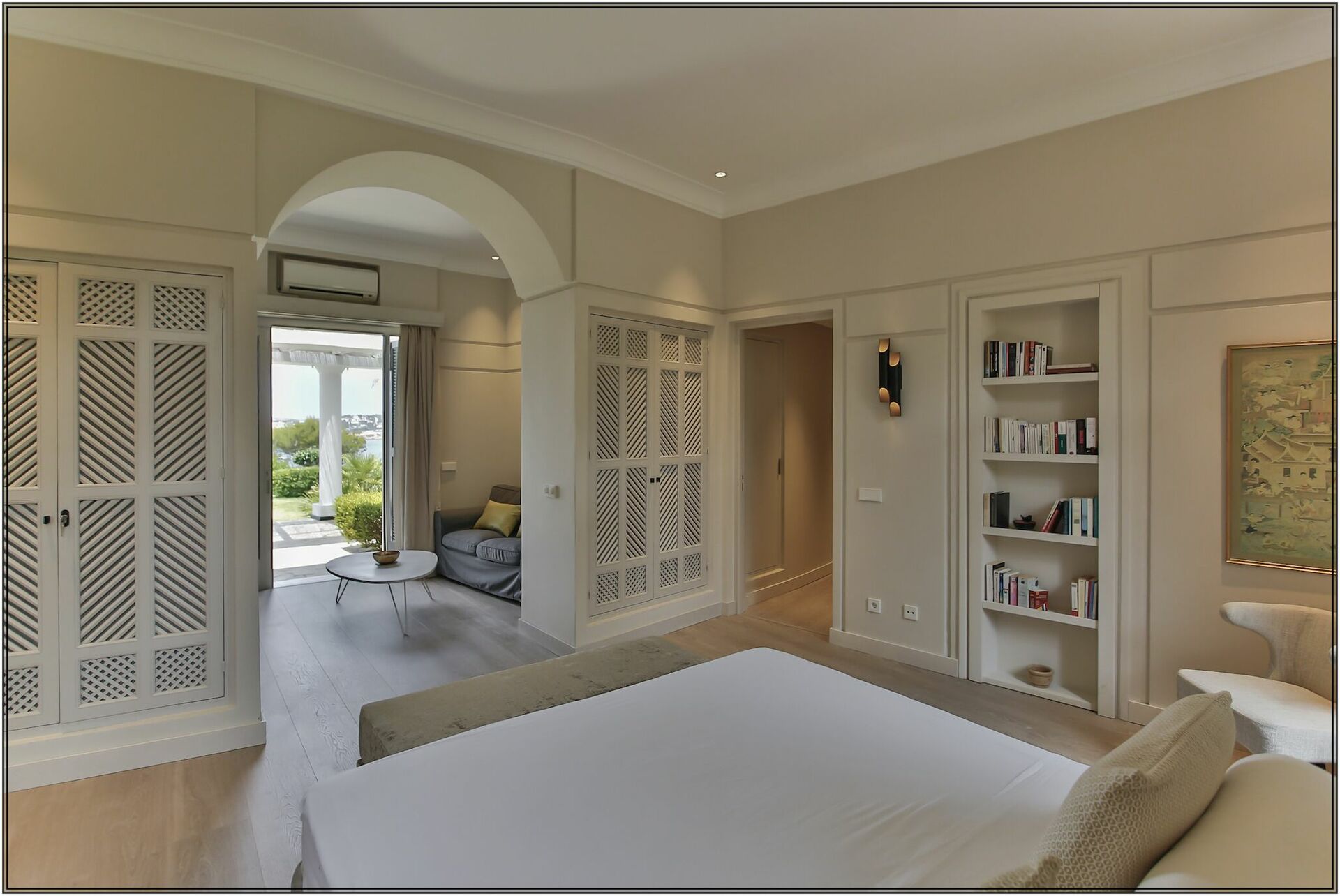 1 master suite met kingsize bed, woonkamer, toegang tot het terras en een grote eigen badkamer met ligbad en douche.