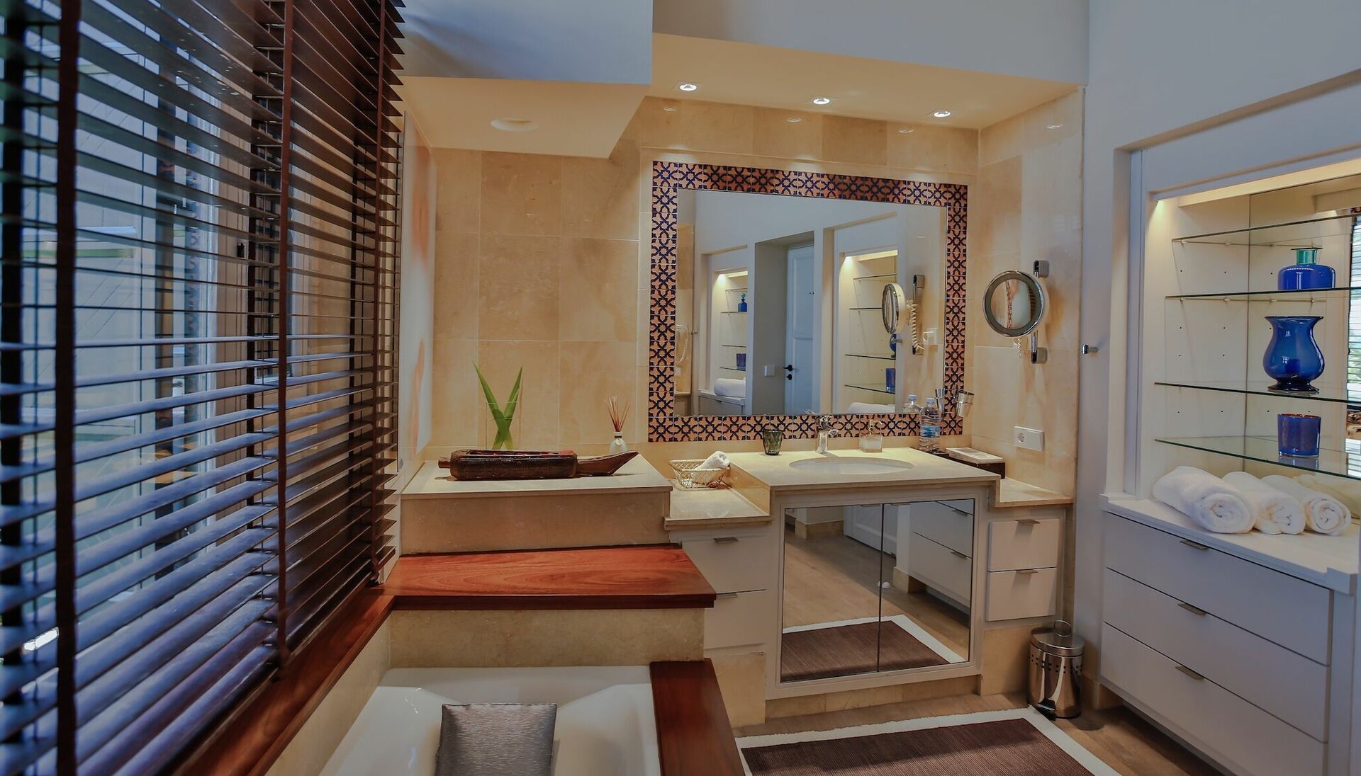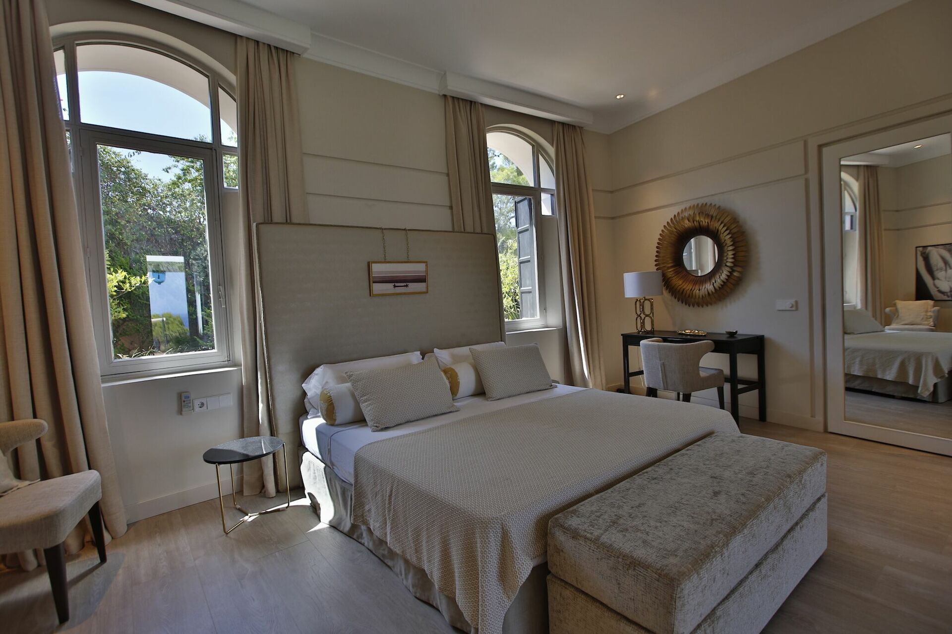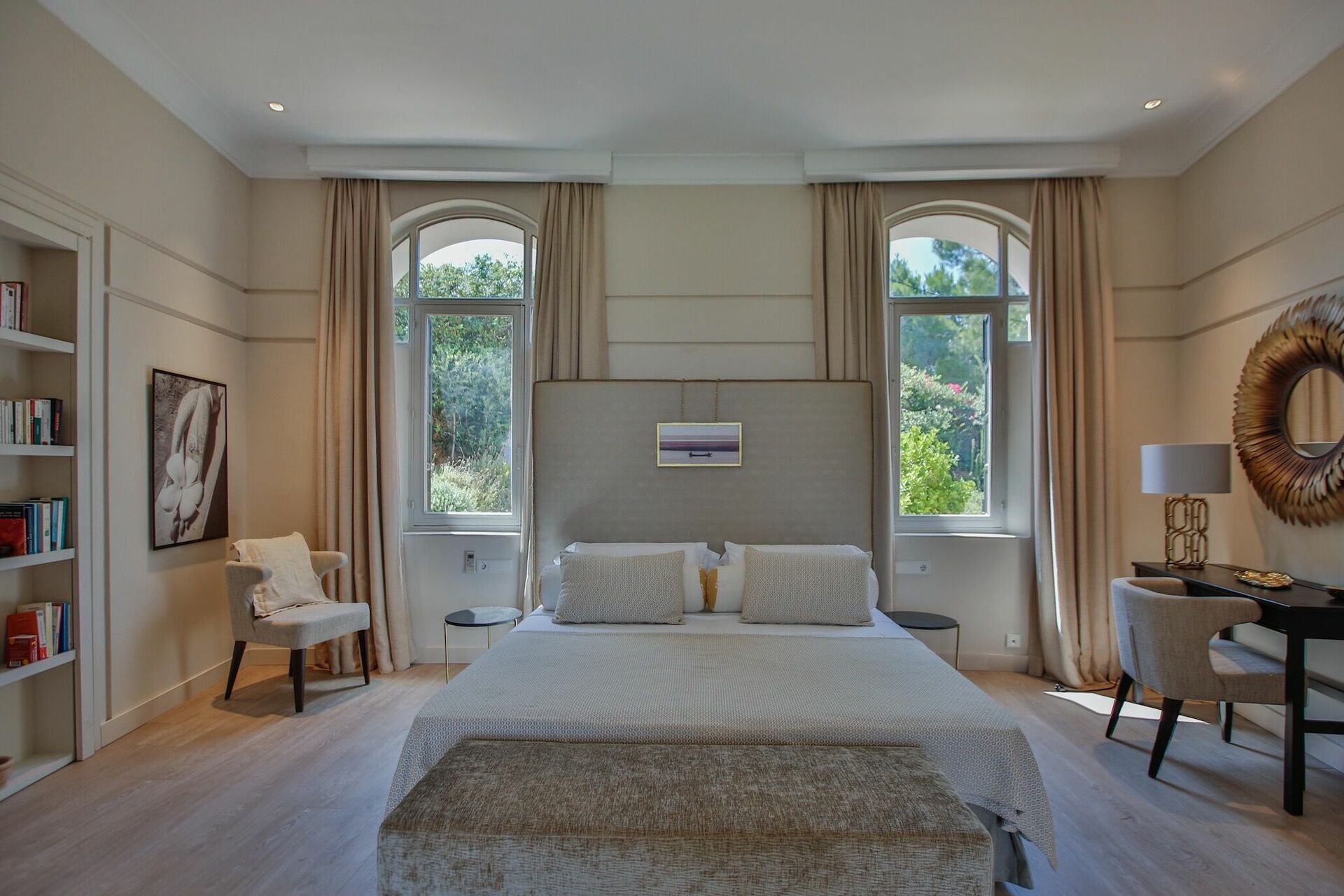 1 master suite met kingsize bed, woonkamer, toegang tot het terras en een grote eigen badkamer met ligbad en douche.